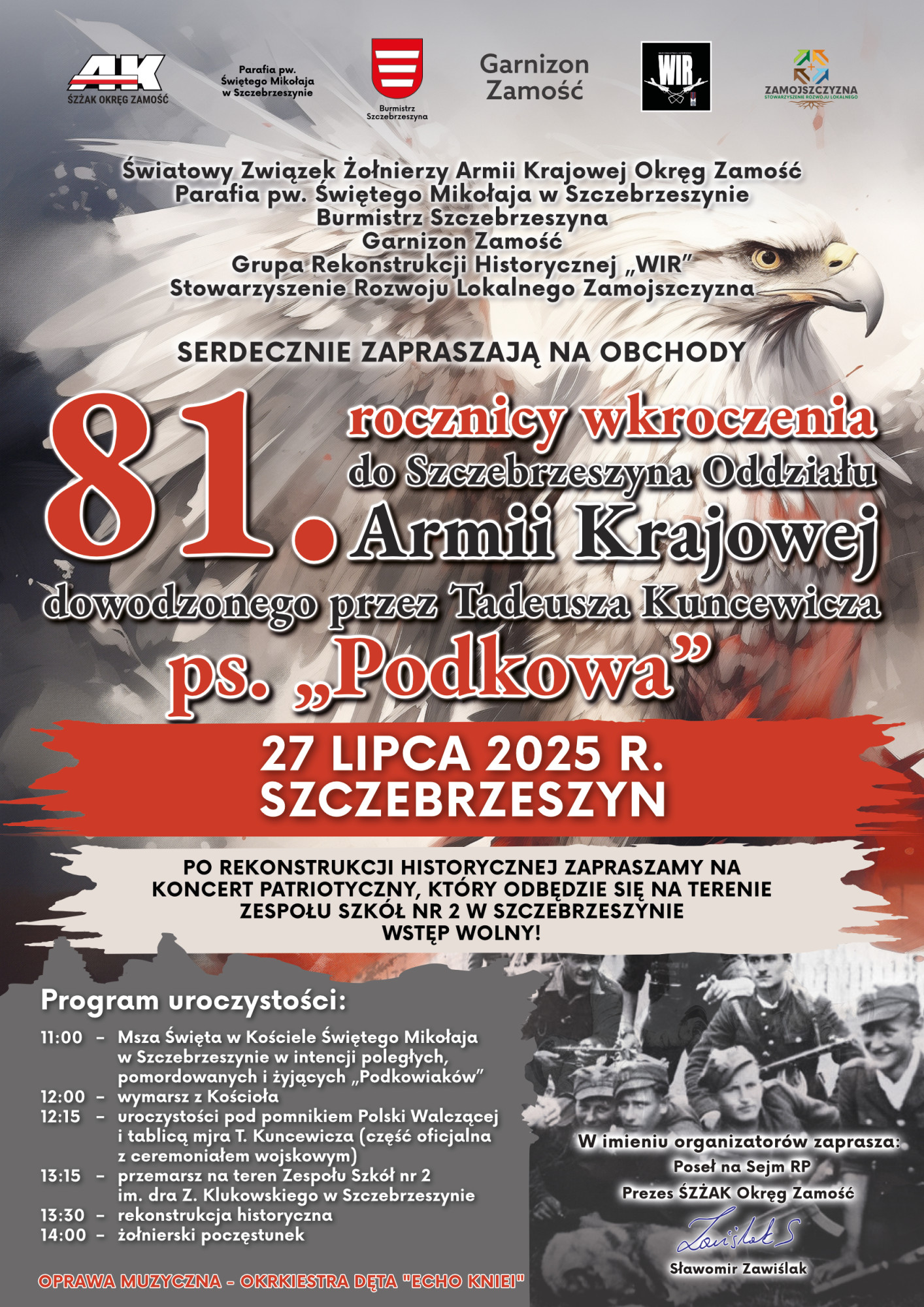 Z okazji 81. rocznicy wkroczenia do Szczebrzeszyna Oddziału Armii Krajowej dowodzonego przez Tadeusza Kuncewicza ps. „Podkowa”, w mieście 27 lipca odbędą się uroczyste obchody upamiętniające bohaterskie wydarzenia i walki polskiego podziemia. Organizatorem wydarzenia jest Światowy Związek Żołnierzy Armii Krajowej Okręg Zamość, we współpracy z Burmistrzem Szczebrzeszyna, Garnizonem Zamość, Parafią pw. Świętego Mikołaja w Szczebrzeszynie, Grupą Rekonstrukcji Historycznej „WIR” oraz Stowarzyszeniem Rozwoju Lokalnego Zamojszczyzna.