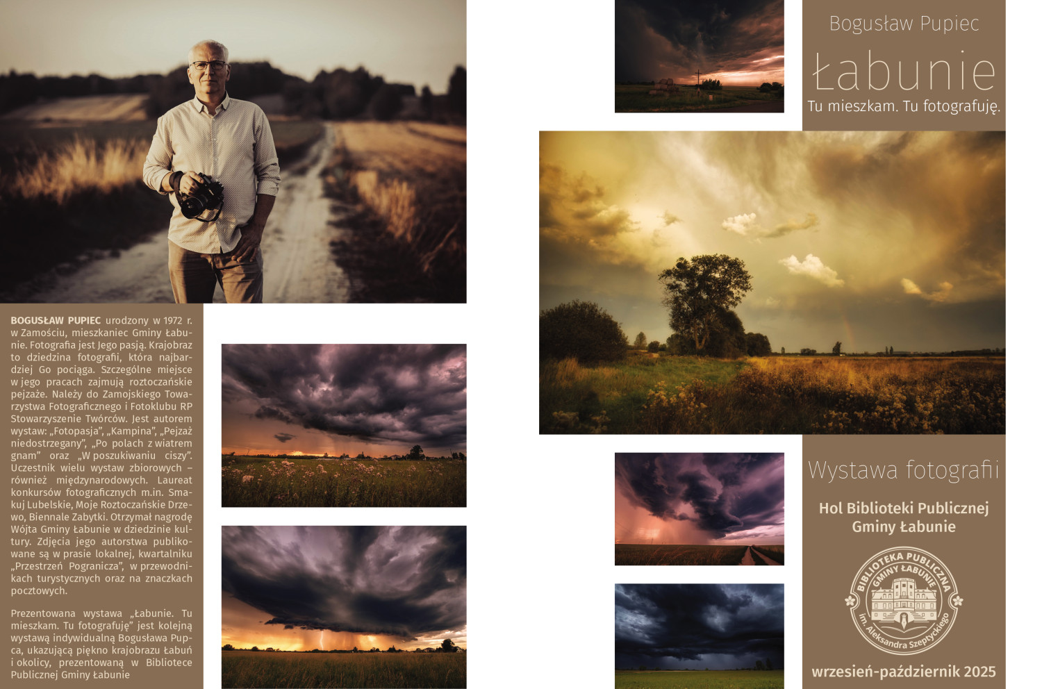 W Bibliotece Publicznej Gminy Łabunie już w sobotę 6 września o godz. 10:00 rozpocznie się coroczne Narodowe Czytanie, które tym razem uświetni wyjątkowa wystawa fotografii autorstwa Bogusława Pupca. Znany i ceniony już z poprzednich edycji artysta tym razem zaprezentuje pejzaże Łabuń i okolic, ukazując piękno lokalnej przyrody w nowym, artystycznym świetle.