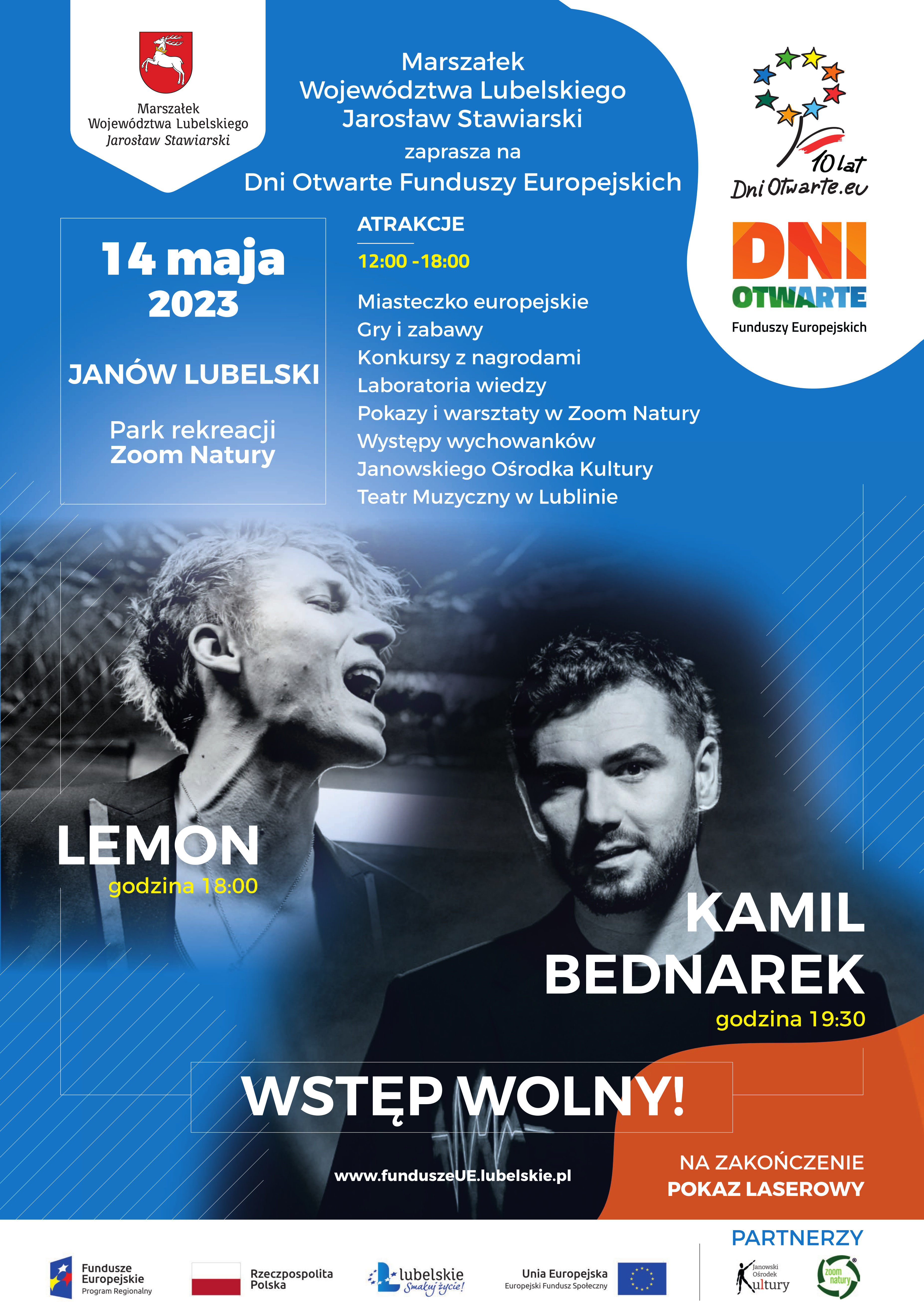 Dni Otwarte Funduszy Europejskich (DOFE) to coroczne święto Funduszy Europejskich, któremu towarzyszą spotkania z Beneficjentami, koncerty i pikniki. We wszystkich regionach Polski organizatorem jest Ministerstwo Funduszy i Polityki Regionalnej. Wydarzenie ma pokazać, jak zmieniło się nasze otoczenie dzięki dotacjom unijnym. W tym roku finał jubileuszowej, X edycji DOFE przypada 14 maja. Gospodarz spotkania, Marszałek Województwa Lubelskiego Jarosław Stawiarski, zaprasza wszystkich mieszkańców do Parku rekreacji Zoom Natury w Janowie Lubelskim, gdzie nie zabraknie atrakcji dla dorosłych, młodzieży czy rodzin z dziećmi. Wisienką na torcie są koncerty zespołu LemON i Kamila Bednarka.