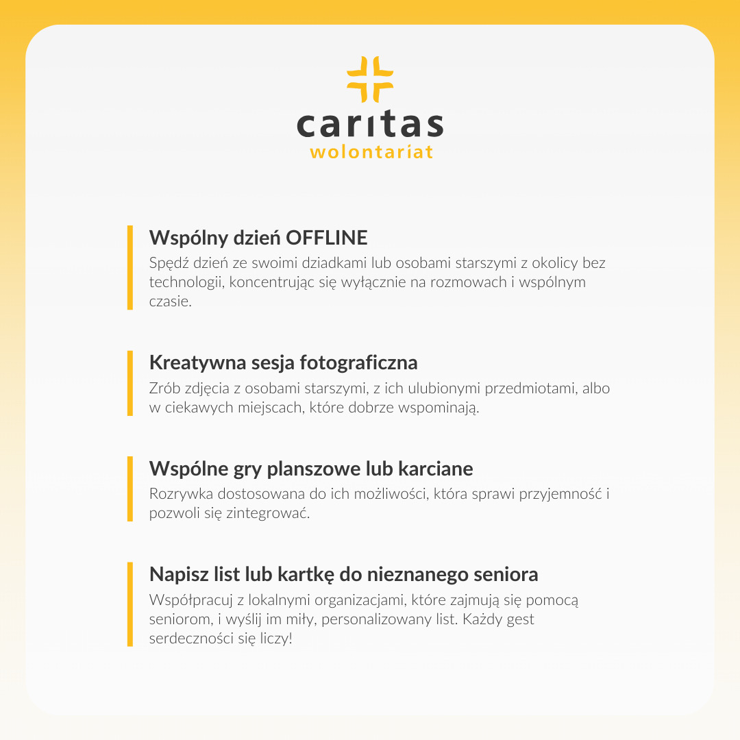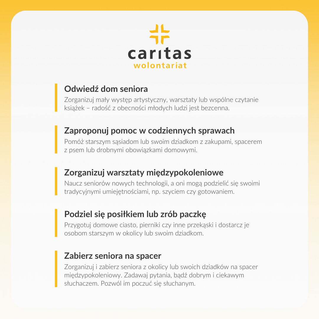Wolontariat Caritas Diecezji Zamojsko-Lubaczowskiej zaprasza każdego, by te dwa dni stały się nie tylko okazją do okazania miłości Państwa dziadkom, ale także czasem, w którym pomyślicie o seniorach w swojej lokalnej społeczności.