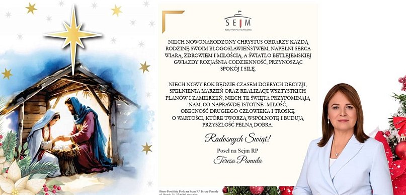 Życzenia świąteczne na Boże Narodzenie i Nowy Rok 2026 składa Teresa Pamuła Poseł na Sejm RP.