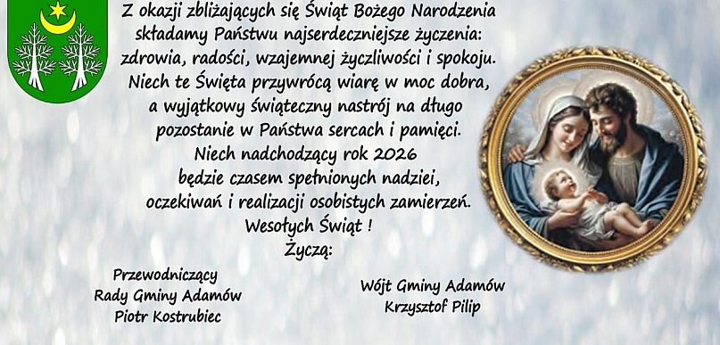 Życzenia świąteczne na Boże Narodzenie i Nowy Rok 2026 składa Gmina Adamów.