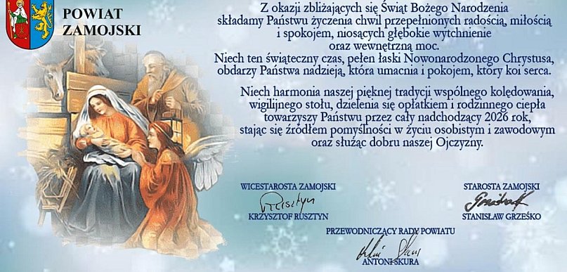 Życzenia świąteczne na Boże Narodzenie i Nowy Rok 2026 składa Powiat Zamojski.