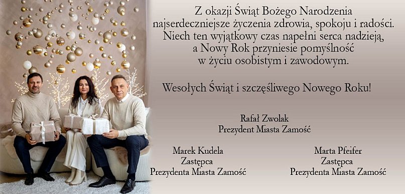 Życzenia świąteczne na Boże Narodzenie i Nowy Rok 2026 składa Urząd Miasta Zamość.