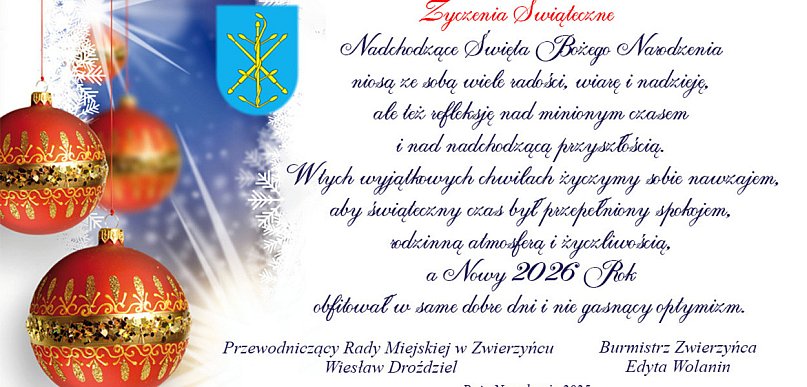 Życzenia świąteczne na Boże Narodzenie i Nowy Rok 2026 składa Urząd Miejski w Zwierzyńcu.