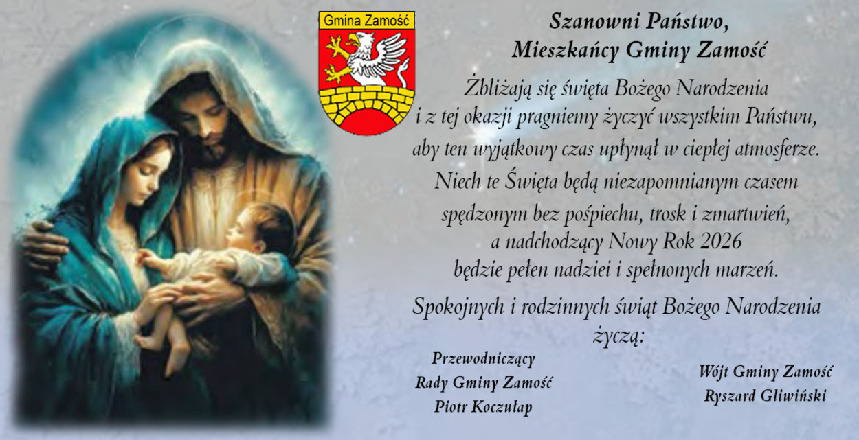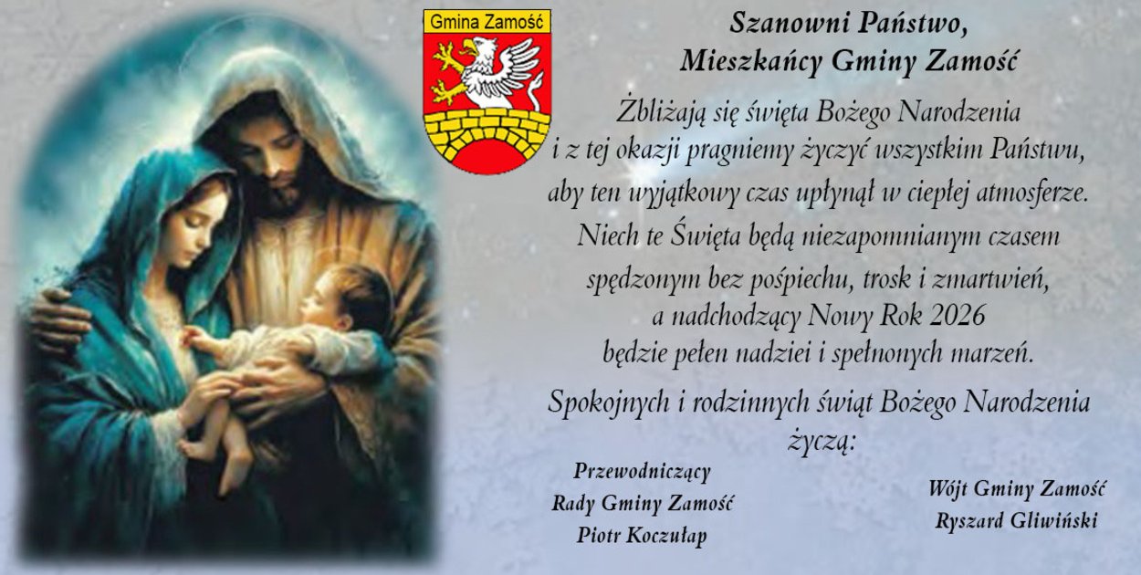 Życzenia świąteczne na Boże Narodzenie i Nowy Rok 2026 składa Gmina Zamość.