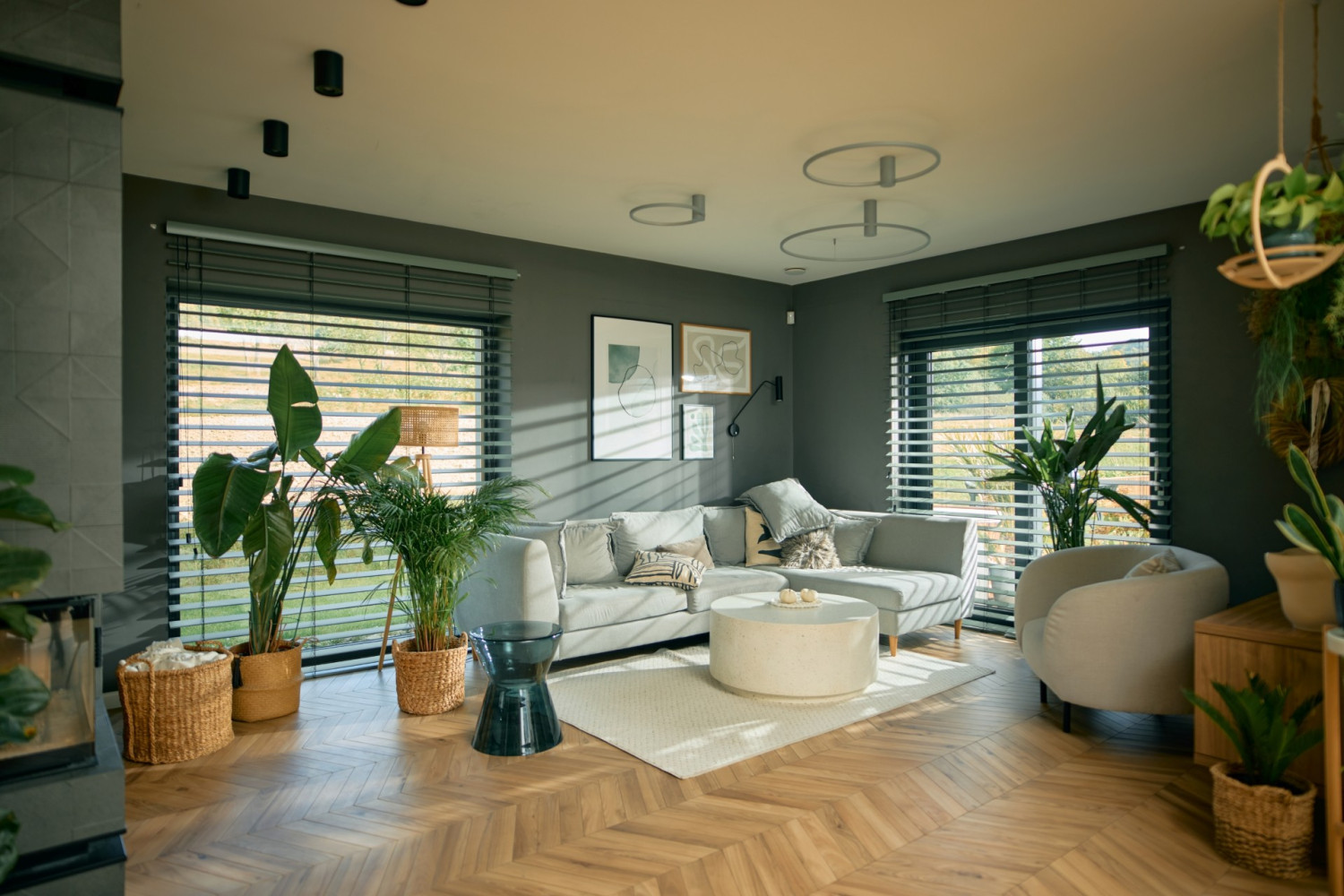 Wieczorem światło zmienia swoją rolę: ma już nie tyle oświetlać, co budować nastrój. Rozproszone lampki, świece, LED-y… i tło, które również tworzy osłona w oknie. Poziome linie lamel budują ciepłą i kameralną przestrzeń. Tam, gdzie pojawiają się duże przeszklenia – okna tarasowe, panoramiczne wyjścia na ogród – znakomicie sprawdzają się szerokie lamele - 50 mm lub 70 mm. Tworzą mocny, graficzny efekt: wieczorem wystarczy ustawić je w pozycji zamkniętej, aby zasłonić wnętrze oraz stworzyć elegancki „hotelowy” charakter. Wyceń żaluzje do swoich okien w kalkulatorze online.