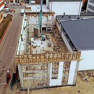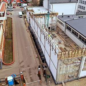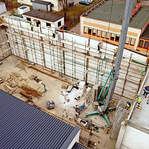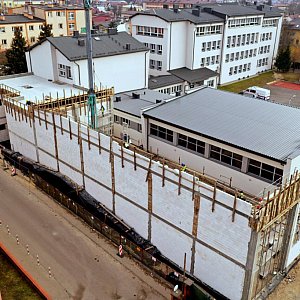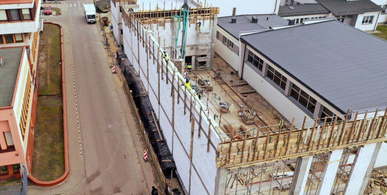 Na terenie Regionalnego Centrum Edukacji Zawodowej w Biłgoraju trwają intensywne prace budowlane nad nowoczesną halą sportową, która ma na celu znaczącą poprawę warunków nauki oraz rozwoju uczniów. Inwestycja, której całkowita wartość wynosi ponad 8,2 miliona złotych, jest w dużej części finansowana ze środków zewnętrznych. Z lotu ptaka widać postęp prac.