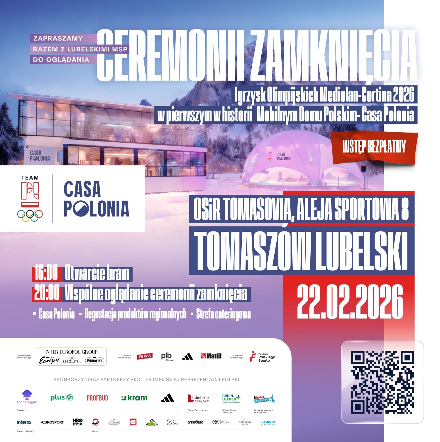 Tomaszów Lubelski 22 lutego stanie się olimpijskim sercem regionu. W OSiR Tomasovia przy Alei Sportowej 8 odbędzie się wspólne oglądanie ceremonii zamknięcia Zimowe Igrzyska Olimpijskie Mediolan–Cortina 2026. Wydarzenie organizowane pod hasłem Casa Polonia połączy sportowe emocje, promocję regionu i rodzinną atmosferę kibicowania.