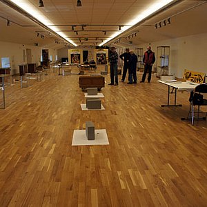 Montaż ekspozycji "Homo Faber" na piętrze Arsenału, czwartek w południe (foto: Piotr Rogalski):