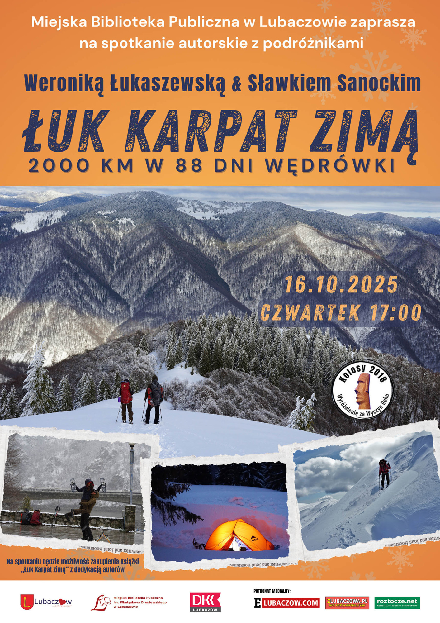 Miejska Biblioteka Publiczna w Lubaczowie zaprasza na spotkanie z Weroniką Łukaszewską i Sławomirem Sanockim – podróżnikami, którzy jako pierwsi na świecie przeszli zimą Łuk Karpat. Spotkanie odbędzie się 16 października 2025 r. o godz. 17:00 w Czytelni Dla Dorosłych.
