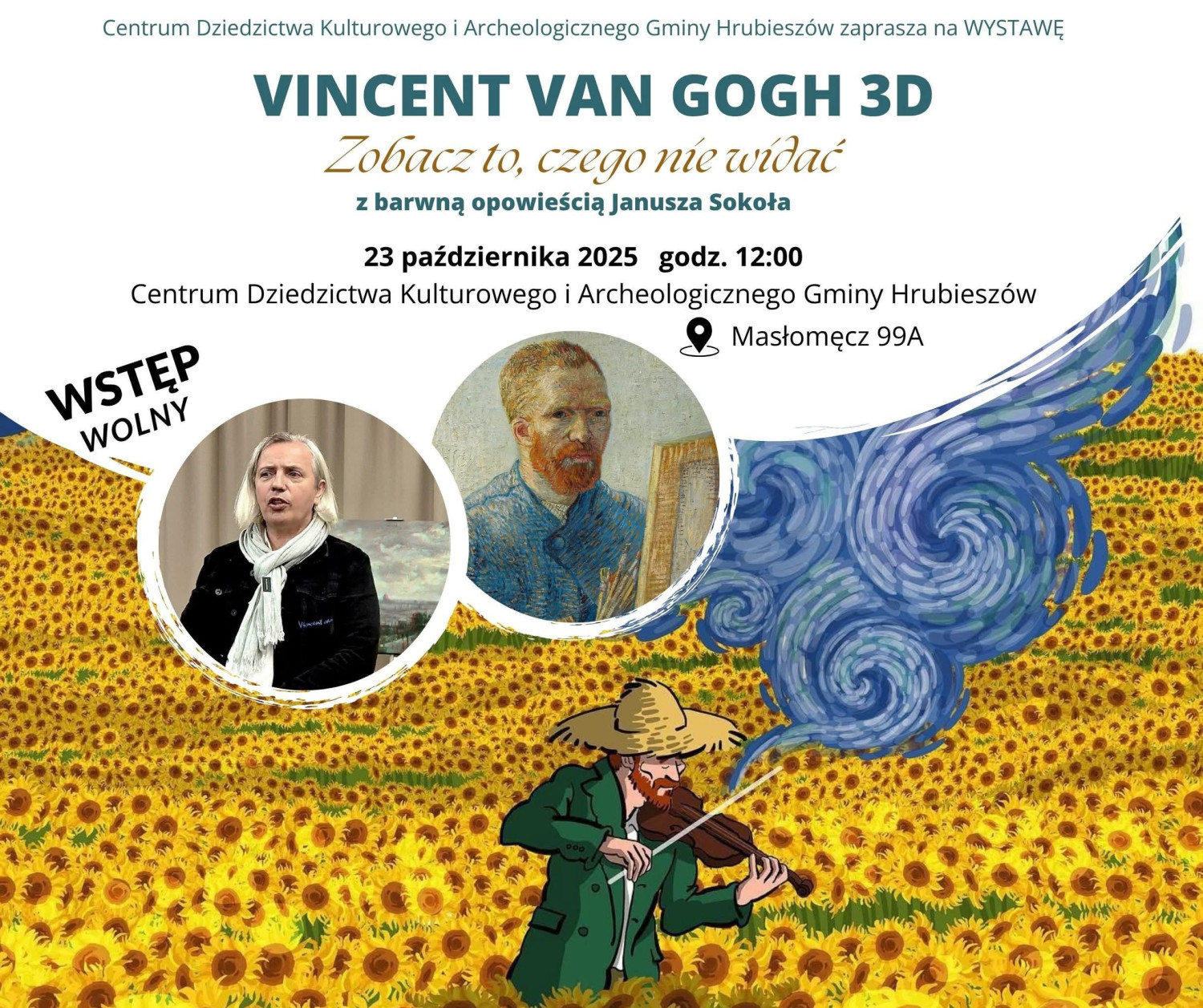 Już 23 października 2025 roku (czwartek) o godz. 12.00 w Centrum Dziedzictwa Kulturowego i Archeologicznego Gminy Hrubieszów w Masłomęczu (Masłomęcz 99A) odbędzie się wyjątkowe wydarzenie artystyczne – „Vincent van Gogh 3D – zobacz to, czego nie widać”.