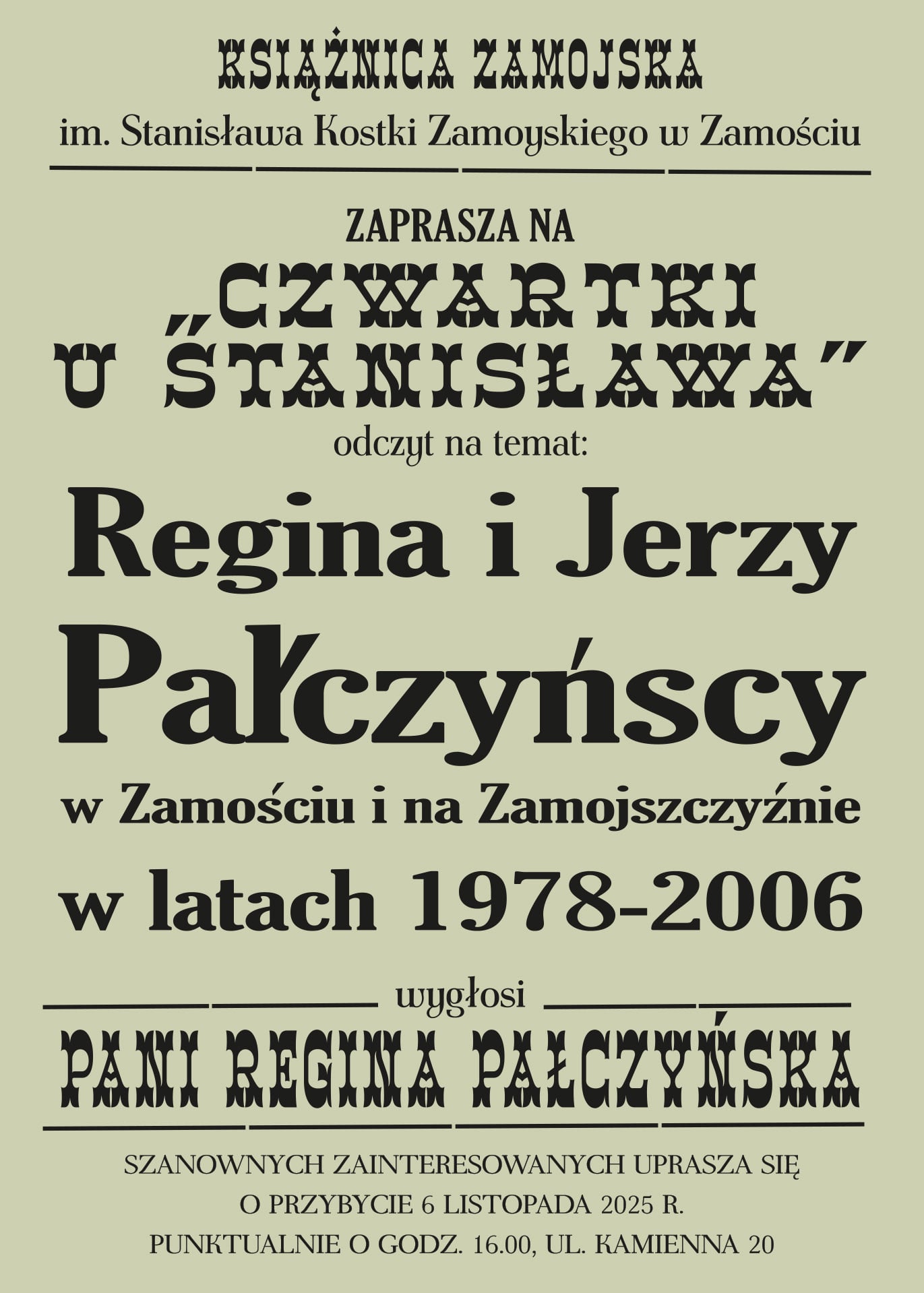 Tematem spotkania będzie działalność Reginy i Jerzego Pałczyńskich w Zamościu i na Zamojszczyźnie w latach 1978–2006.Odczyt wygłosi pani Regina Pałczyńska.