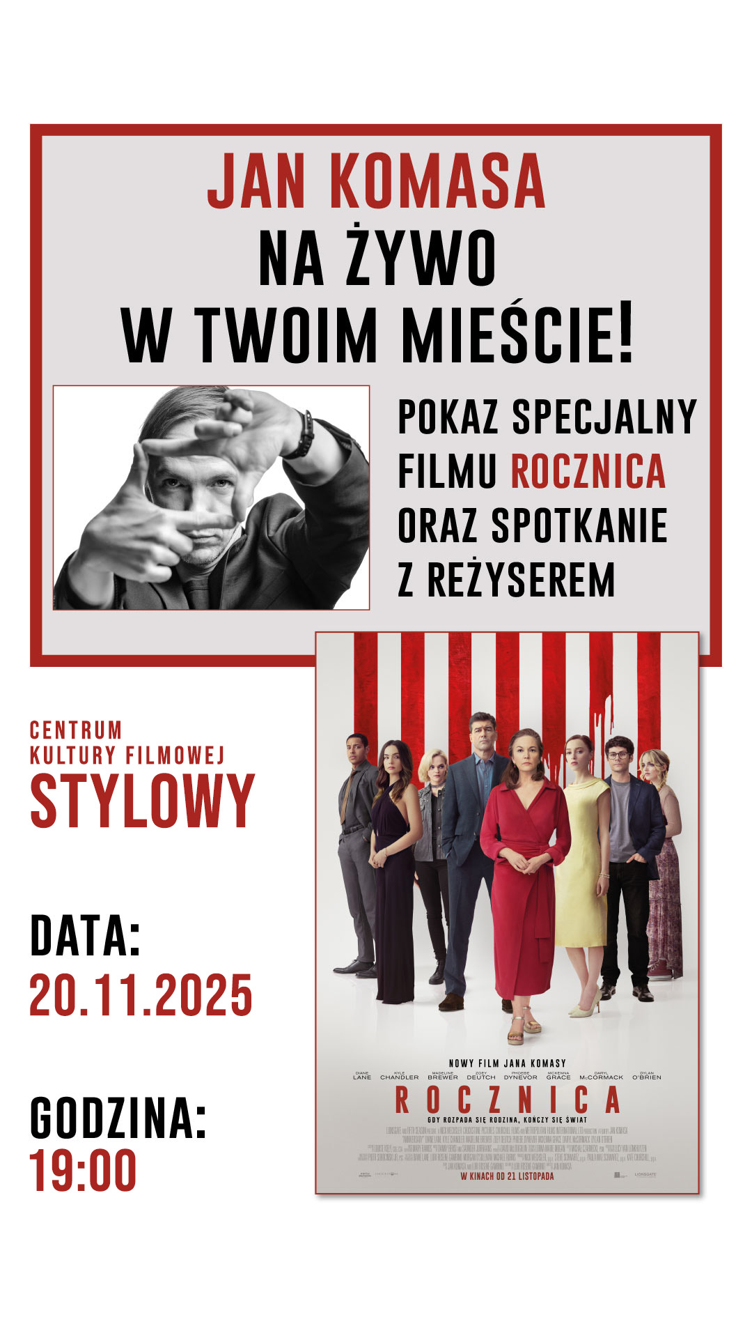Centrum Kultury Filmowej „Stylowy” w Zamościu przygotowało wyjątkową gratkę dla miłośników kina. Już 20 listopada 2025 roku o godz. 19:00 odbędzie się przedpremierowy pokaz najnowszego filmu Jana Komasy – „Rocznica”, połączony ze spotkaniem z samym reżyserem, jednym z najgłośniejszych polskich twórców młodego pokolenia.