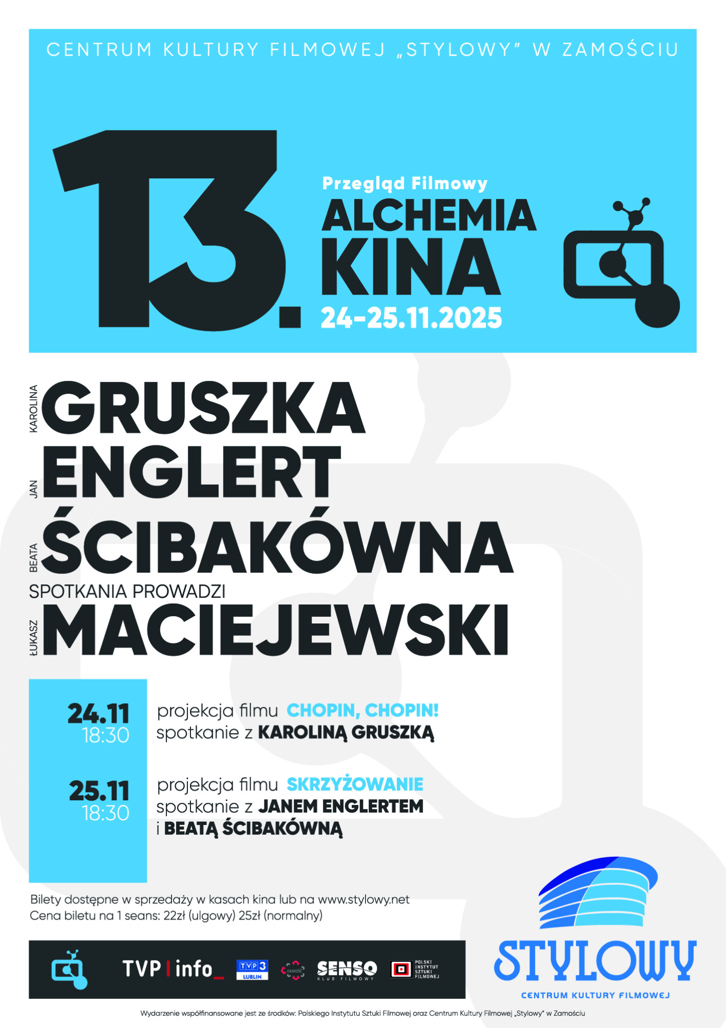 Karolina Gruszka, Jan Englert i Beata Ścibakówna gośćmi 13. Przeglądu Filmowego ALCHEMIA KINA Promocja Polskiego Filmu. Spotkania z twórcami poprowadzi Łukasz Maciejewski – publicysta i krytyk filmowy. W alchemicznym repertuarze: "Chopin, Chopin!" oraz „Skrzyżowanie”. 13. Alchemia Kina odbędzie się w dniach 24-25 listopada 2025 godz. 18:30 w Centrum Kultury Filmowej „Stylowy” w Zamościu.