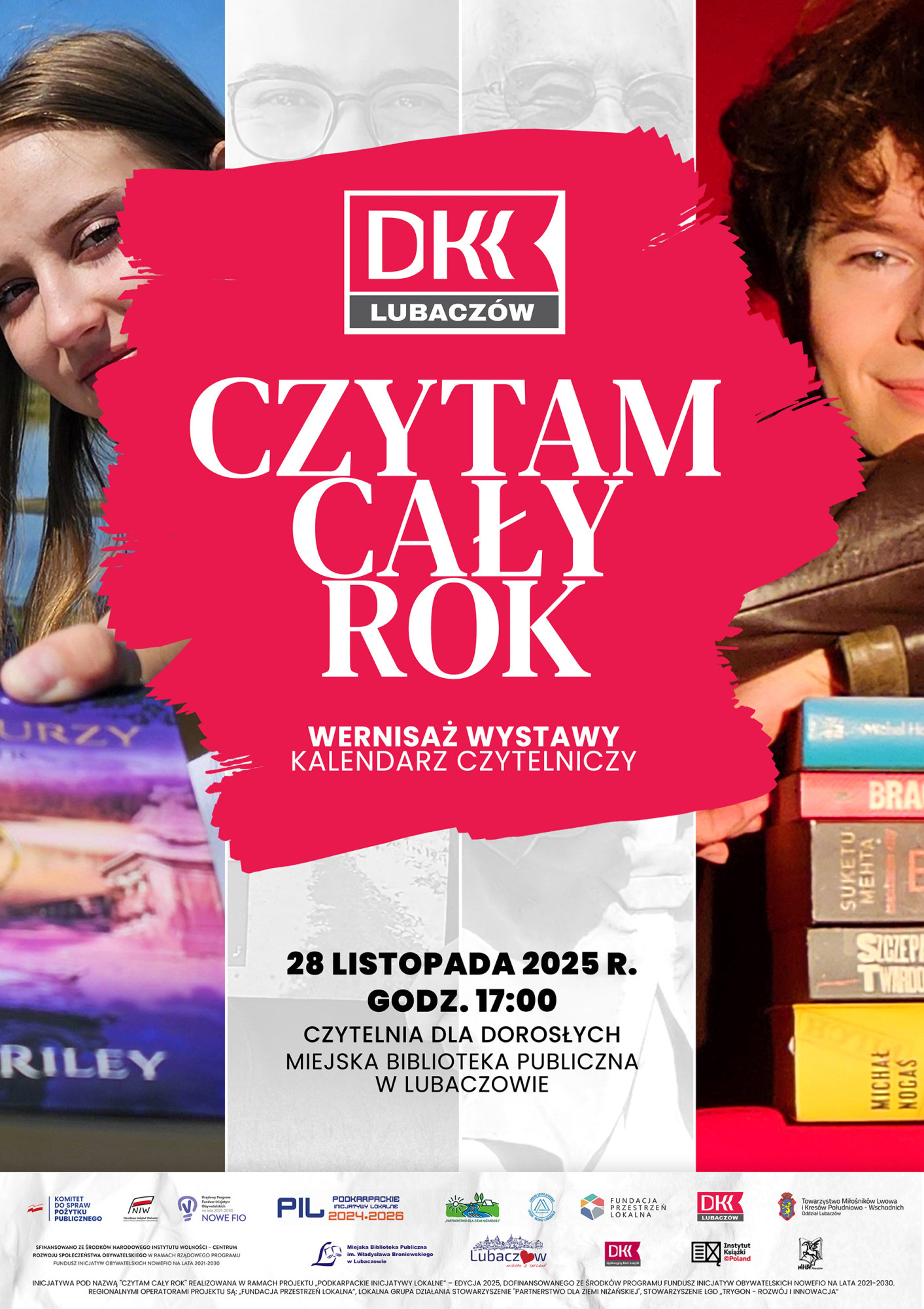 Dyskusyjny Klub Książki w Lubaczowie zaprasza na promocję Kalendarza Czytelniczego 2026 oraz wernisaż wystawy przygotowanej w ramach projektu „Czytam cały rok”. Wydarzenie stanowi podsumowanie działań zrealizowanych przez Dyskusyjny Klub Książki w ramach Podkarpackich Inicjatyw Lokalnych – Edycja 2025.