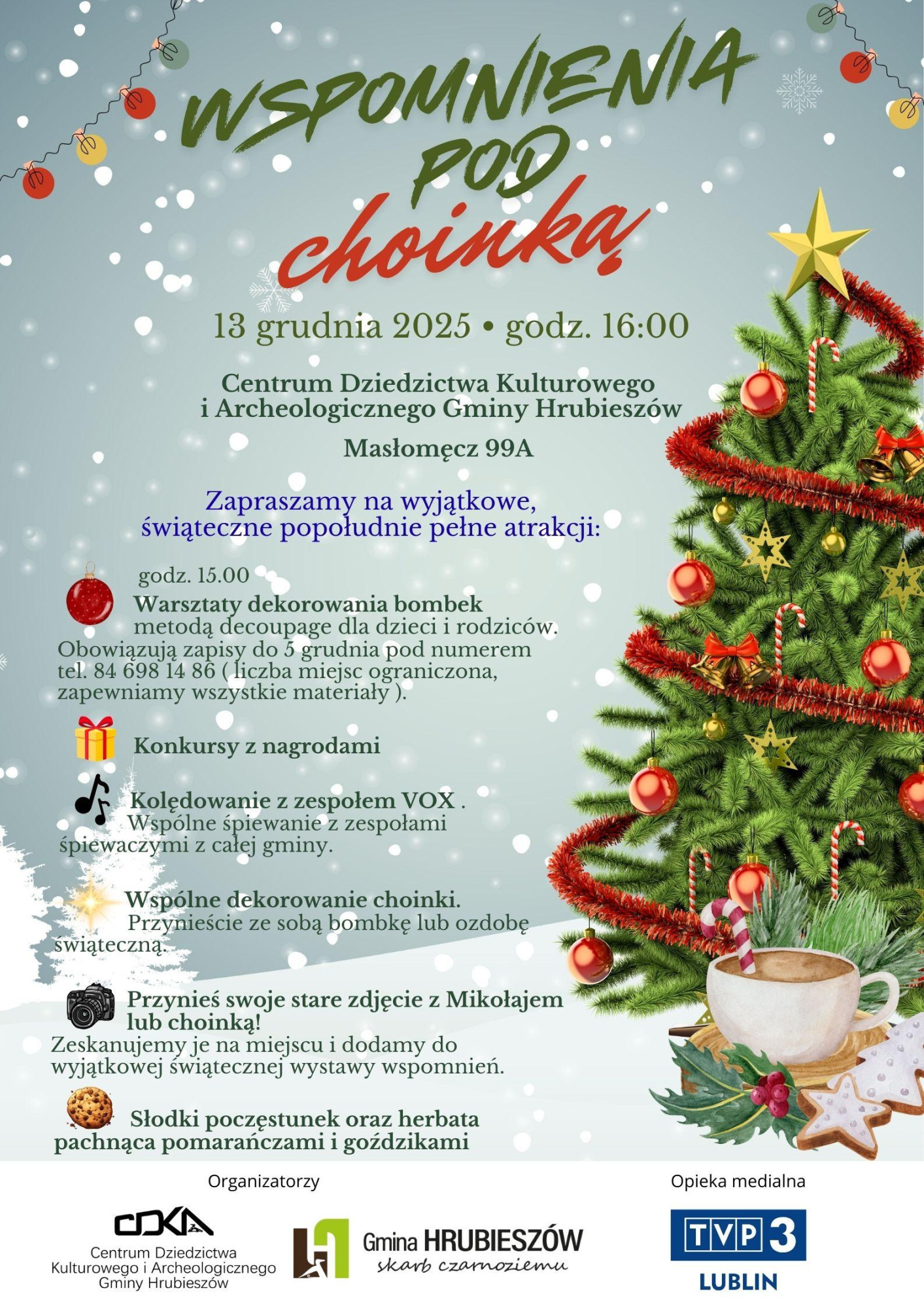 Świąteczna atmosfera zawita do Gminy Hrubieszów 13 grudnia 2025 r. o godz. 16:00. W Centrum Dziedzictwa Kulturowego i Archeologicznego w Masłomęczu odbędzie się wyjątkowe wydarzenie „Wspomnienia pod choinką”, które połączy tradycję, wspólnotę i rodzinne ciepło. Organizatorzy przygotowali atrakcje dla dzieci, dorosłych i całych rodzin. Jedną z nich będą kreatywne warsztaty dekorowania bombek metodą decoupage. Nie zabraknie także rywalizacji i dobrej zabawy. Na uczestników czekają świąteczne konkursy z nagrodami ufundowanymi przez Narodowy Bank Polski, przygotowane z okazji 1000-lecia koronacji Bolesława Chrobrego.