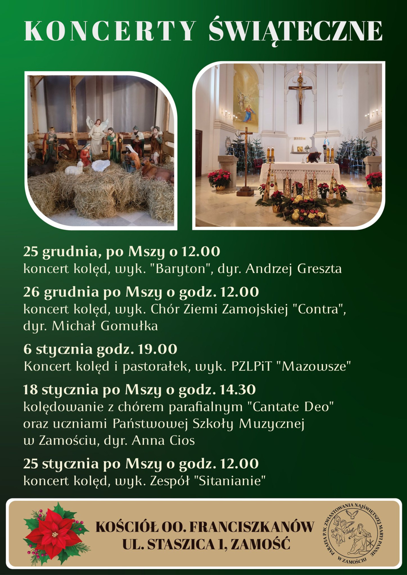 Organizatorami koncertu są oo. Franciszkanie z Zamościa. Wieczór kolędowy zapowiada się jako połączenie tradycji bożonarodzeniowej z wysokim poziomem artystycznym. W programie znajdą się zarówno znane i lubiane kolędy, jak i mniej popularne pastorałki w wyjątkowych aranżacjach.