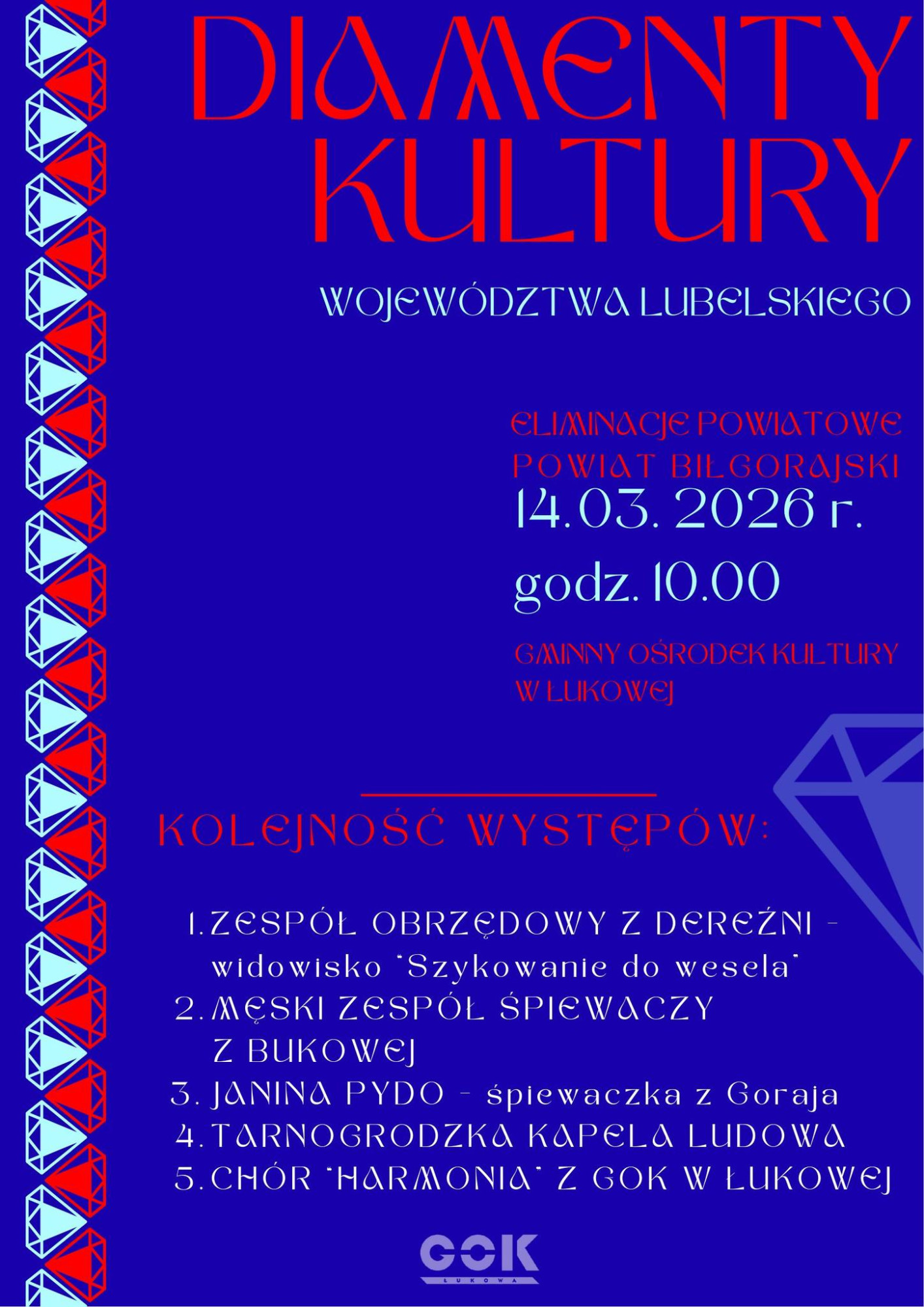 Podczas wydarzenia na scenie zaprezentują się uczestnicy rywalizujący o awans do etapu wojewódzkiego Konkursu „Diamenty Kultury”. Artyści z powiatu biłgorajskiego pokażą swoje umiejętności w różnych formach artystycznych, dostarczając publiczności wielu niezapomnianych wrażeń.