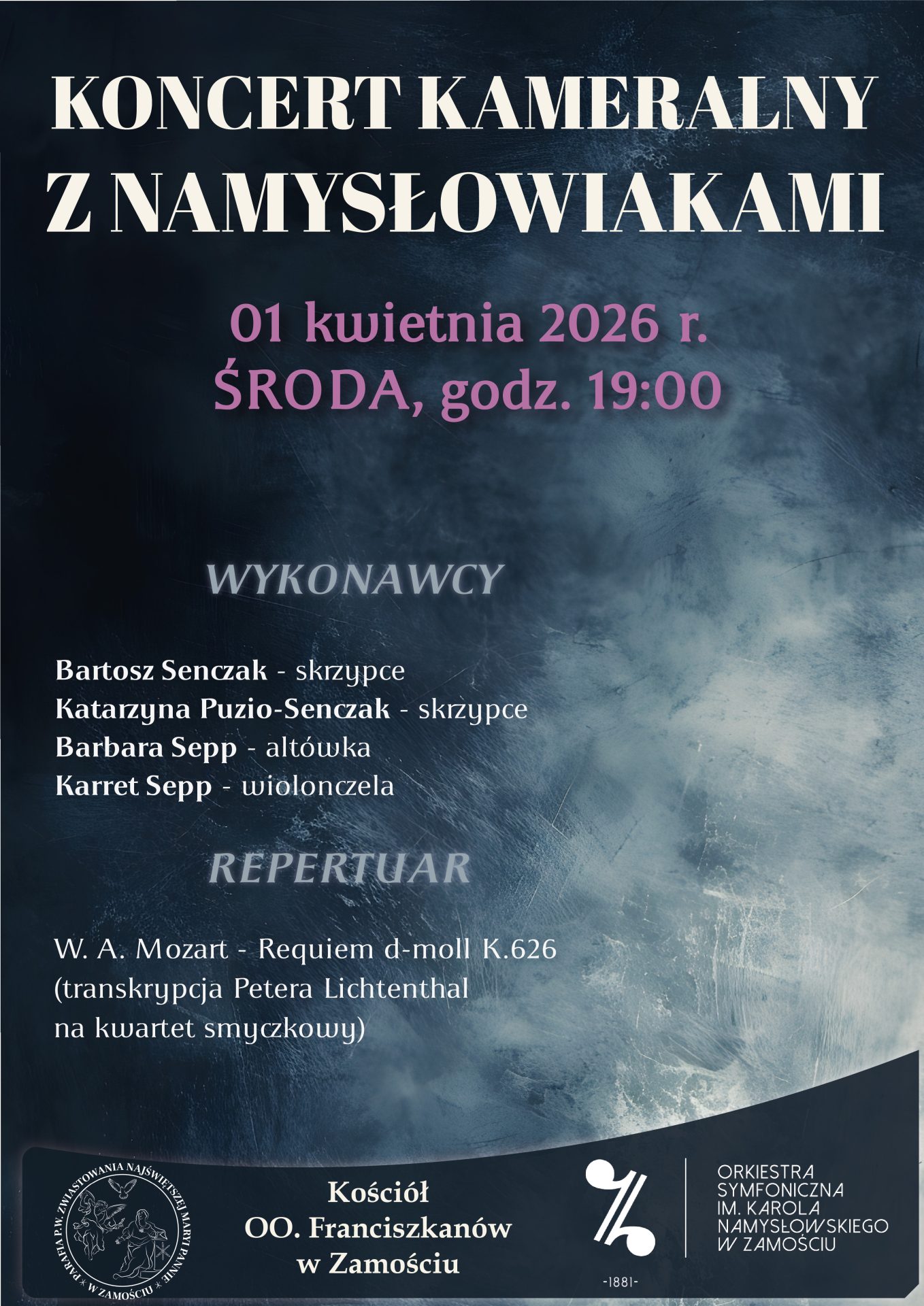 Już 1 kwietnia 2026 roku o godz. 19:00 w kościele pw. Zwiastowania NMP, OO. Franciszkanów w Zamościu odbędzie się Koncert Kameralny z udziałem artystów Orkiestry Symfonicznej im. Karola Namysłowskiego.