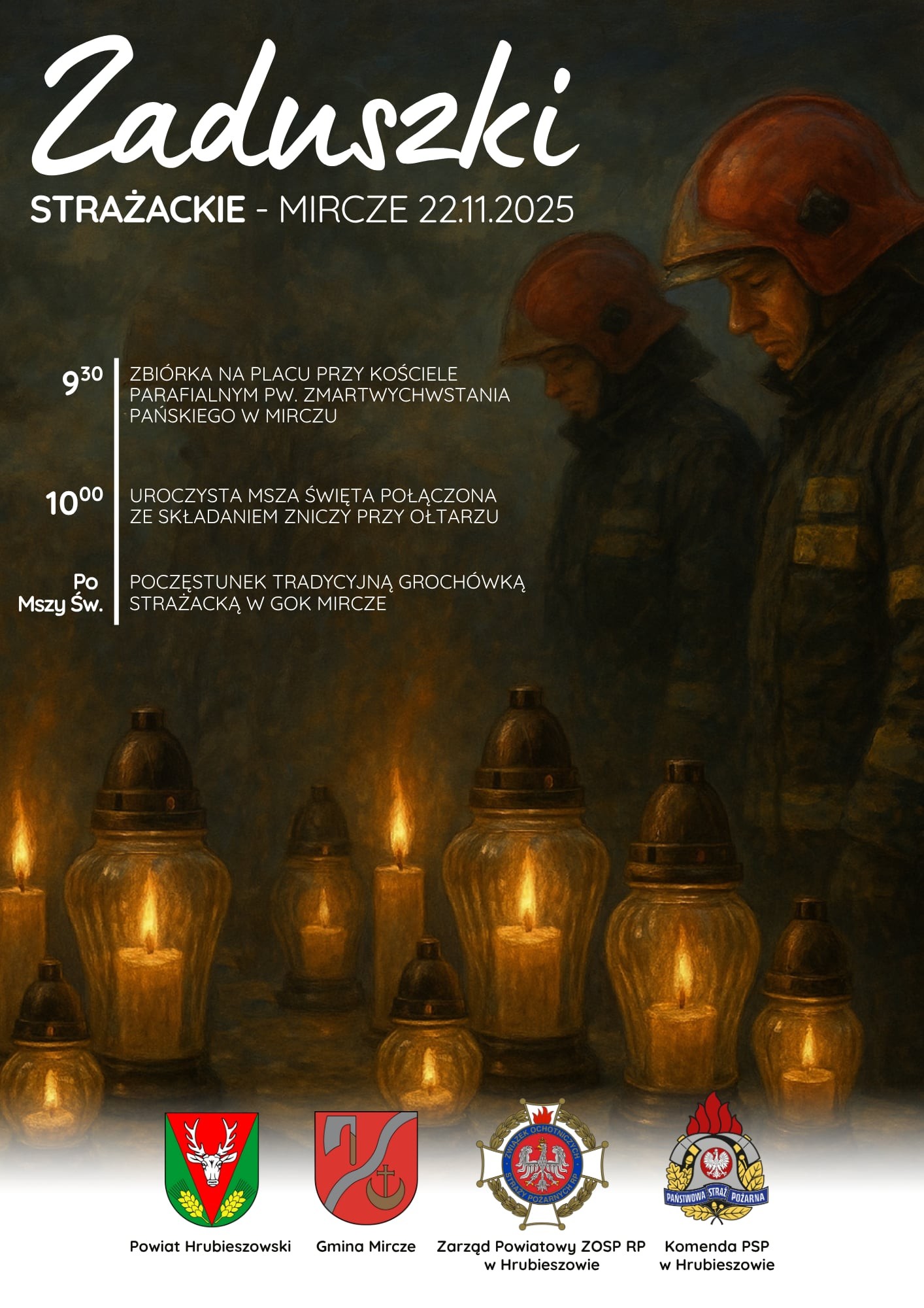Obchody rozpoczną się o godz. 9:30, kiedy uczestnicy zbiorą się na placu przy kościele parafialnym pw. Zmartwychwstania Pańskiego w Mirczu. O godz. 10:00 rozpocznie się uroczysta Msza Święta, podczas której strażacy złożą znicze przy ołtarzu – jako symbol pamięci, wdzięczności i strażackiego braterstwa, które trwa także poza granicą życia. Po zakończeniu liturgii, wszyscy uczestnicy zostaną zaproszeni na tradycyjną grochówkę strażacką, którą podadzą gospodarze w Gminnym Ośrodku Kultury w Mirczu. Będzie to czas na rozmowę, wspomnienia oraz spotkanie strażackich pokoleń.