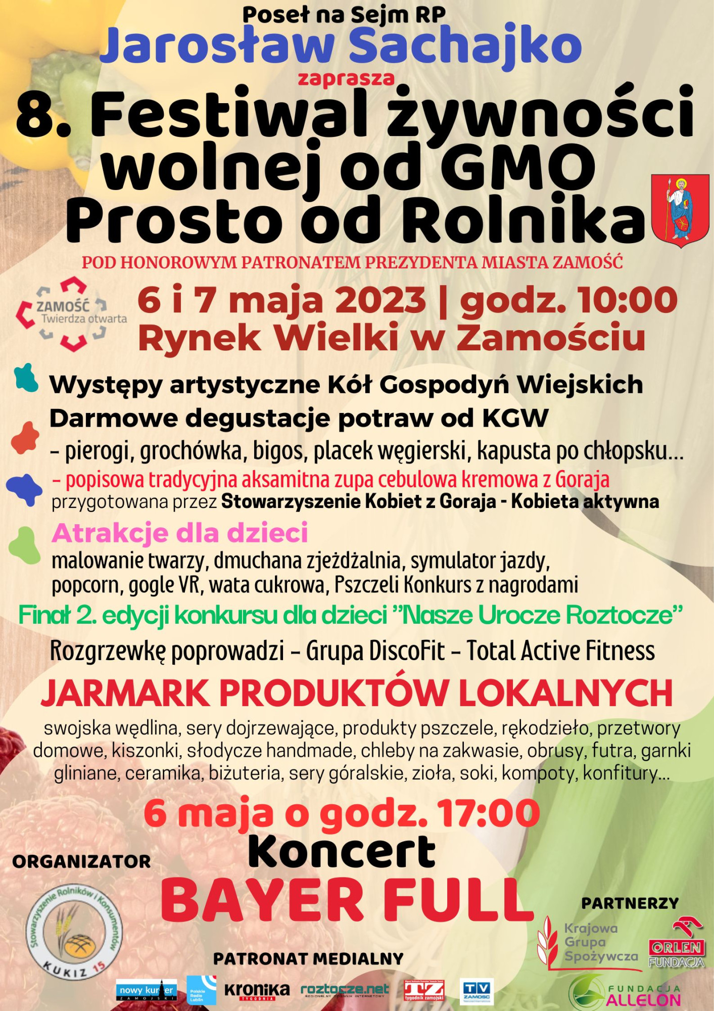 W dniach 6 i 7 maja 2023 roku na Rynku Wielkim w Zamościu odbędzie się 8. FESTIWAL ŻYWNOŚCI WOLNEJ OD GMO PROSTO OD ROLNIKA organizowany przez Stowarzyszenie Rolników i Konsumentów na który serdecznie zaprasza Poseł Jarosław Sachajko, przewodniczący Stowarzyszenia.