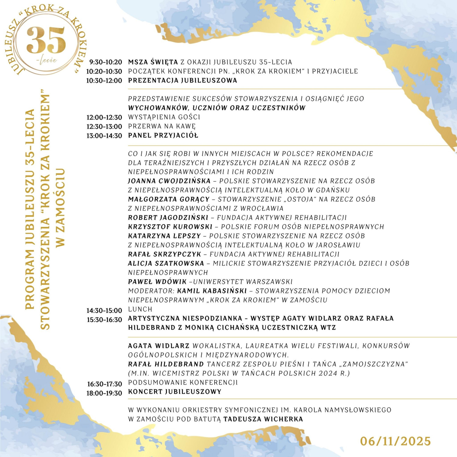 Stowarzyszenie Pomocy Dzieciom Niepełnosprawnym „Krok za krokiem” w Zamościu obchodzi w tym roku 35-lecie swojej działalności. Uroczystości połączone z konferencją i koncertem odbędą się 6 listopada w Kompleksie Wspomaganego Mieszkalnictwa „Rodzinny Dom” przy ul. Kresowej 24.
