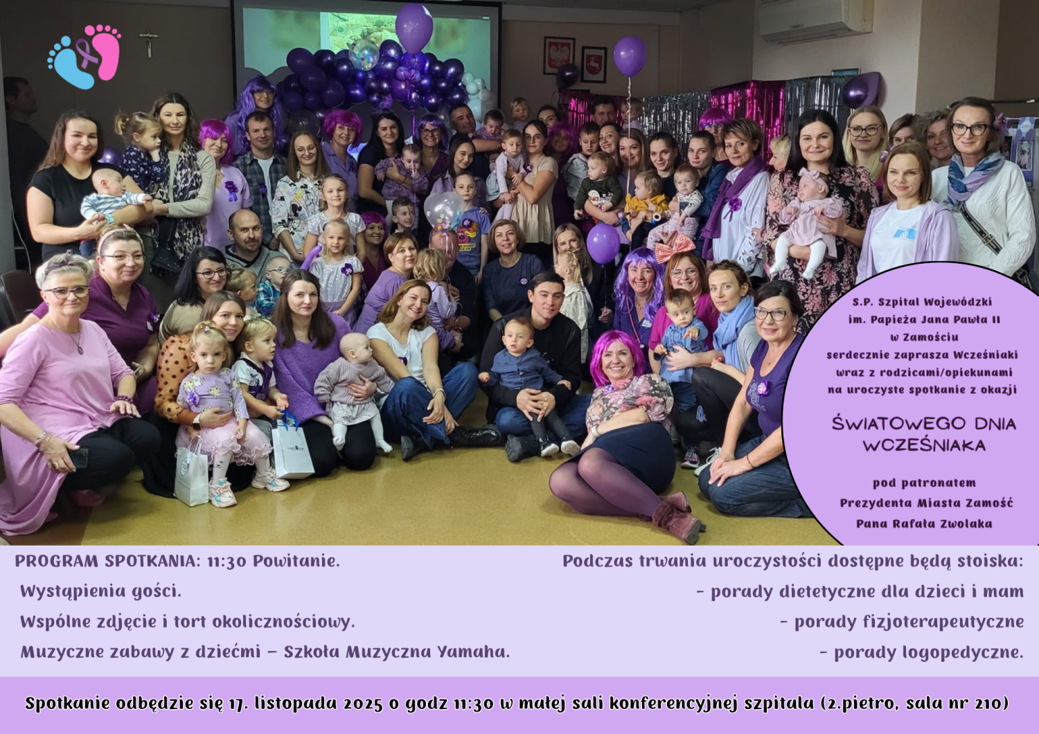S.P. Szpital Wojewódzki im. Papieża Jana Pawła II w Zamościu zaprasza wcześniaki wraz z rodzicami i opiekunami na wyjątkowe spotkanie z okazji Światowego Dnia Wcześniaka, które odbędzie się 17 listopada 2025 roku o godz. 11:30 w małej sali konferencyjnej szpitala (2. piętro, sala nr 210). Uroczystość odbędzie się pod patronatem Prezydenta Miasta Zamość Rafała Zwolaka.
