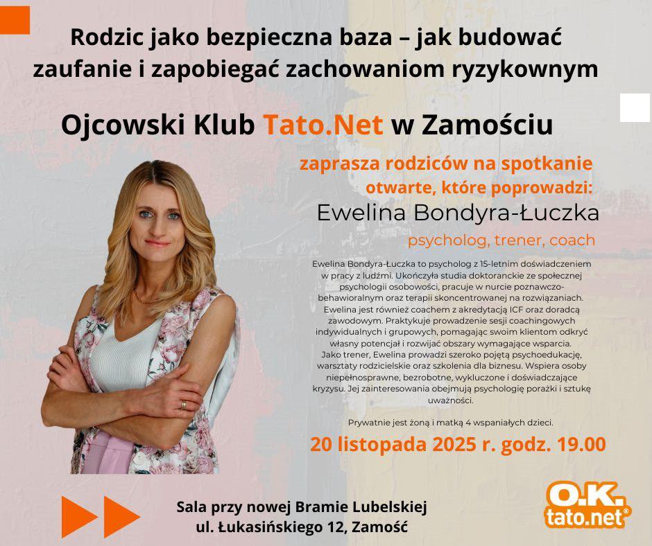 Już 20 listopada 2025 r. o godz. 19:00 w sali przy Nowej Bramie Lubelskiej w Zamościu (ul. Łukasińskiego 12) odbędzie się spotkanie otwarte dla rodziców organizowane przez Ojcowski Klub Tato.Net w Zamościu.