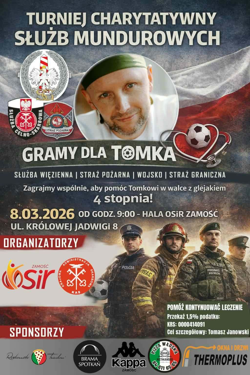 Już 8 marca w hali Ośrodka Sportu i Rekreacji w Zamościu odbędzie się charytatywny turniej służb mundurowych pod hasłem „Gramy dla Tomka”. Wydarzenie ma na celu wsparcie leczenia Tomasza Janowskiego, który zmaga się z glejakiem IV stopnia – jednym z najgroźniejszych nowotworów mózgu.