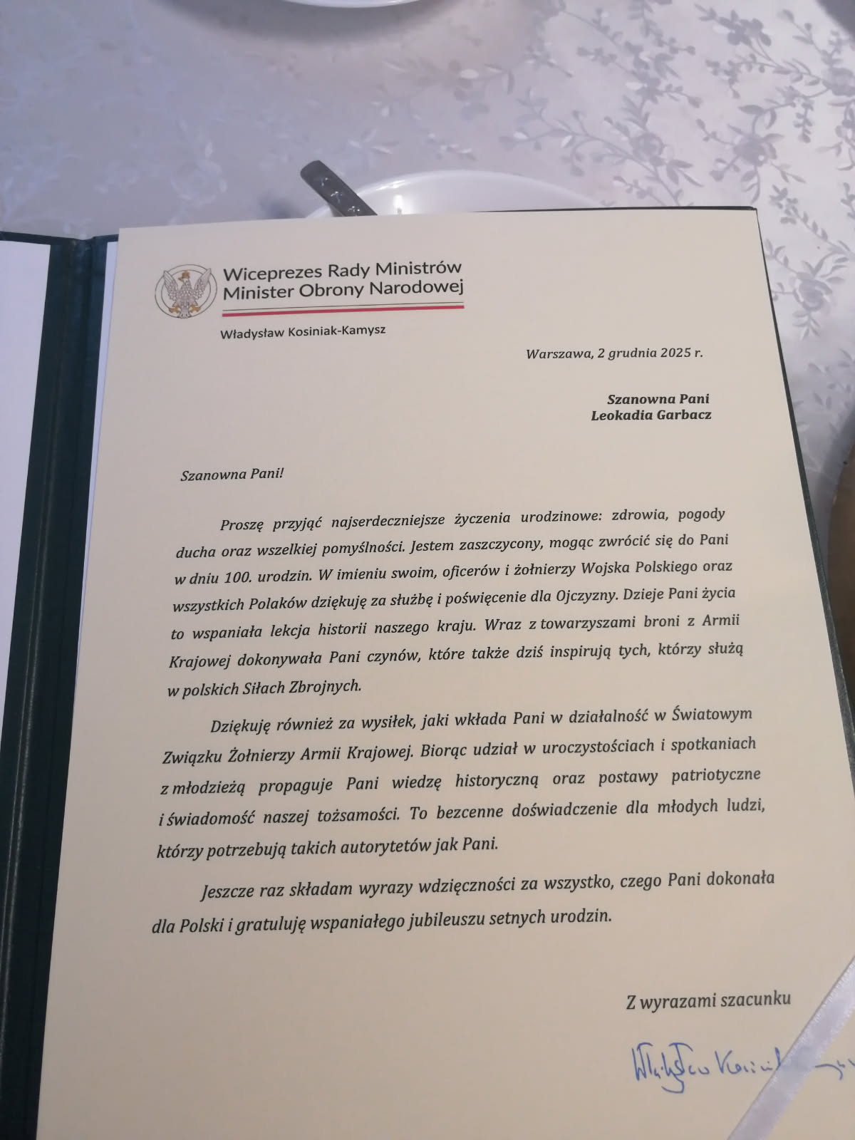 Warto podkreślić, że to właśnie Prezes Sławomir Zawiślak, działając w imieniu zrzeszonych w Związku społeczników i patriotów, wystąpił do Ministerstwa Obrony Narodowej z wnioskiem o szczególne uhonorowanie Pani Leokadii. W odpowiedzi Jubilatka otrzymała honorowy ryngraf oraz list gratulacyjny od Ministra Obrony Narodowej, które w dniu urodzin wręczyli żołnierze 192. Batalionu Obrony Pogranicza 19. Nadbużańskiej Brygady Obrony Terytorialnej.