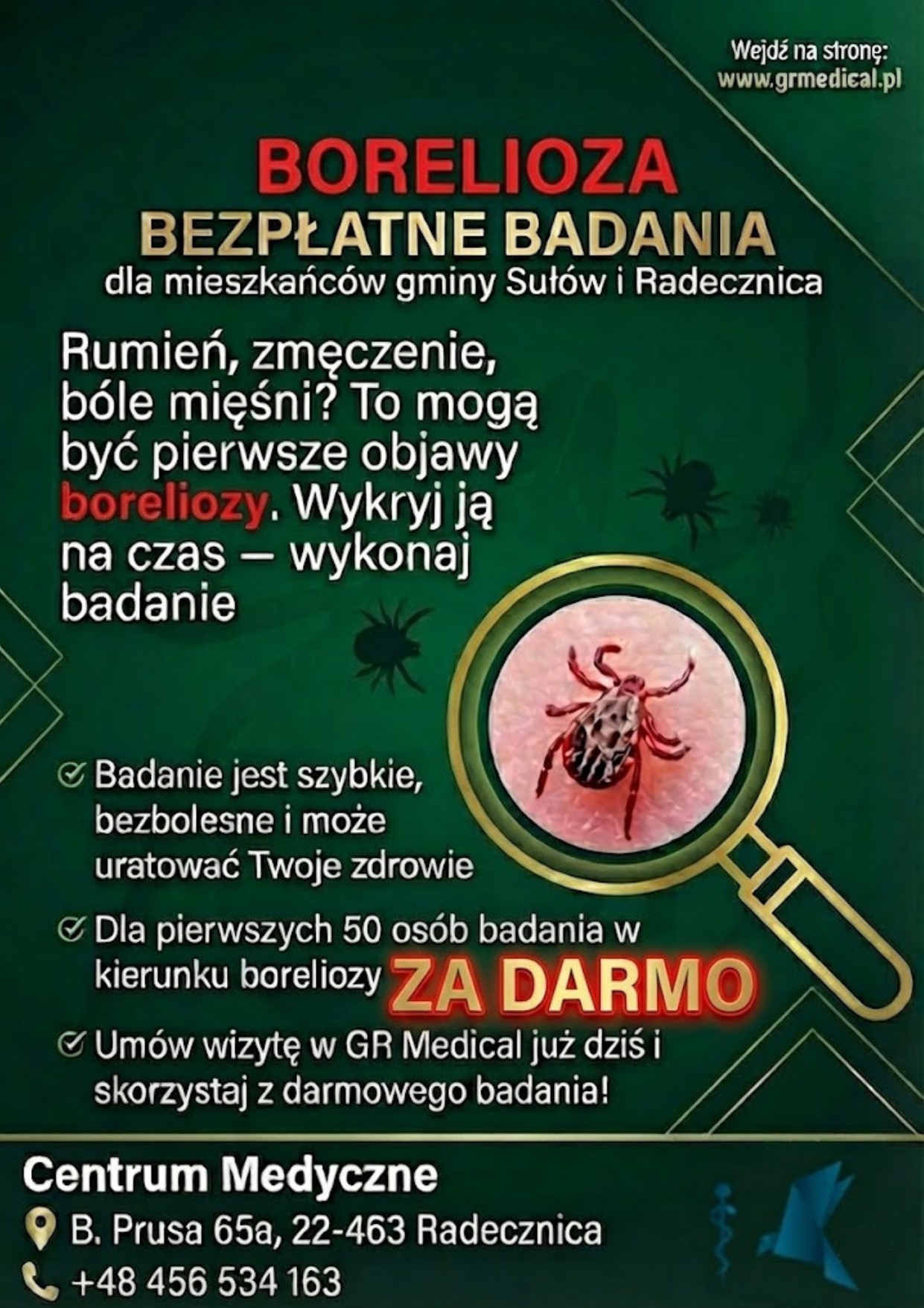 Z myślą o mieszkańcach Gmin Sułów i Radecznica uruchomiono program bezpłatnych badań w kierunku boreliozy. To inicjatywa mająca na celu poprawę profilaktyki zdrowotnej oraz zwiększenie świadomości na temat zagrożeń wynikających z ukąszeń kleszczy.