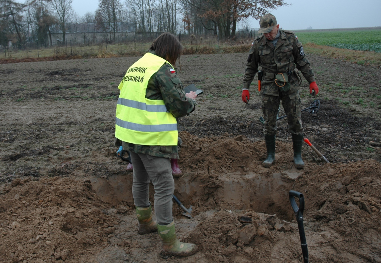 Już po około godzinie prac Marta Kiecak-Dołgan zarejestrowała silny sygnał wykrywacza metali. Pod nadzorem kierownik poszukiwań Joanny Krzyszczuk rozpoczęto ostrożne odkrywanie znaleziska. Po kilkudziesięciu centymetrach ziemi ukazał się charakterystyczny, obły kształt niemieckiego hełmu. Chwilę później potwierdzono, że pod nim znajduje się ludzka czaszka. Dalsze prace natychmiast przerwano, a na miejsce powiadomiono Wojewódzkiego Konserwatora Zabytków. Do Miączyna skierowany został archeolog, kustosz Muzeum Fortyfikacji i Broni Arsenał w Zamościu Andrzej Maziarz. Pod jego nadzorem poszerzono wykop tak, aby jama grobowa znalazła się w części centralnej, umożliwiając bezpieczne prowadzenie badań archeologicznych. Mimo niesprzyjających warunków atmosferycznych – temperatury bliskiej zeru, deszczu i zapadających ciemności – archeolog pracował nieprzerwanie przez blisko 10 godzin. Jego precyzja i cierpliwość zrobiły ogromne wrażenie na uczestnikach działań.
