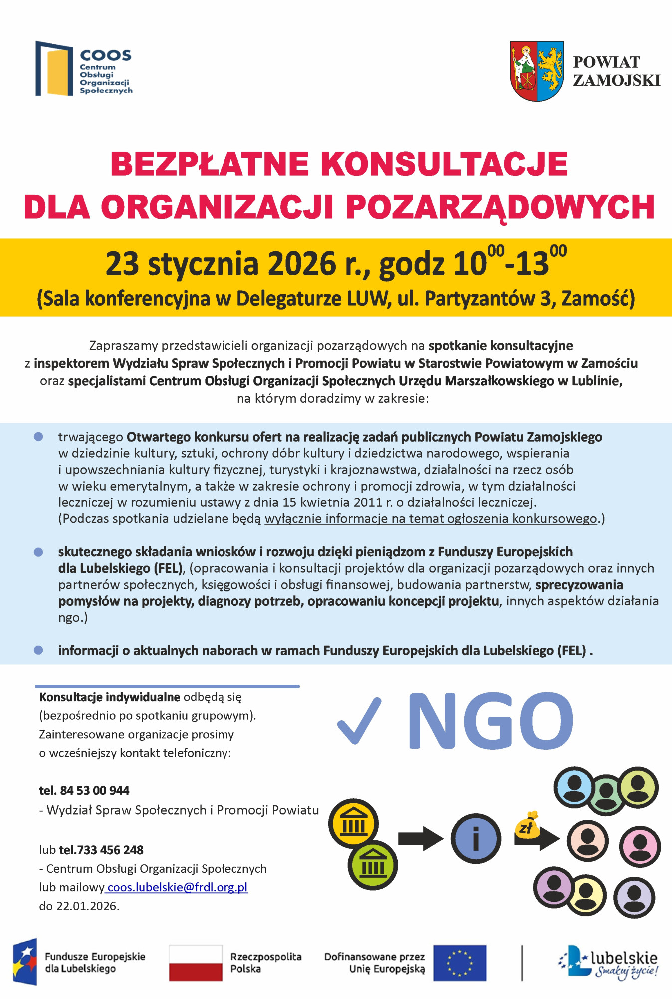 Bezpłatne konsultacje dla organizacji pozarządowych odbędą się 23 stycznia 2026 roku w Zamościu. Przedstawiciele NGO z Powiatu Zamojskiego będą mogli skorzystać z fachowego wsparcia w zakresie otwartych konkursów ofert oraz pozyskiwania środków z Funduszy Europejskich dla Lubelskiego. Spotkanie organizują Starostwo Powiatowe w Zamościu oraz Centrum Obsługi Organizacji Społecznych.