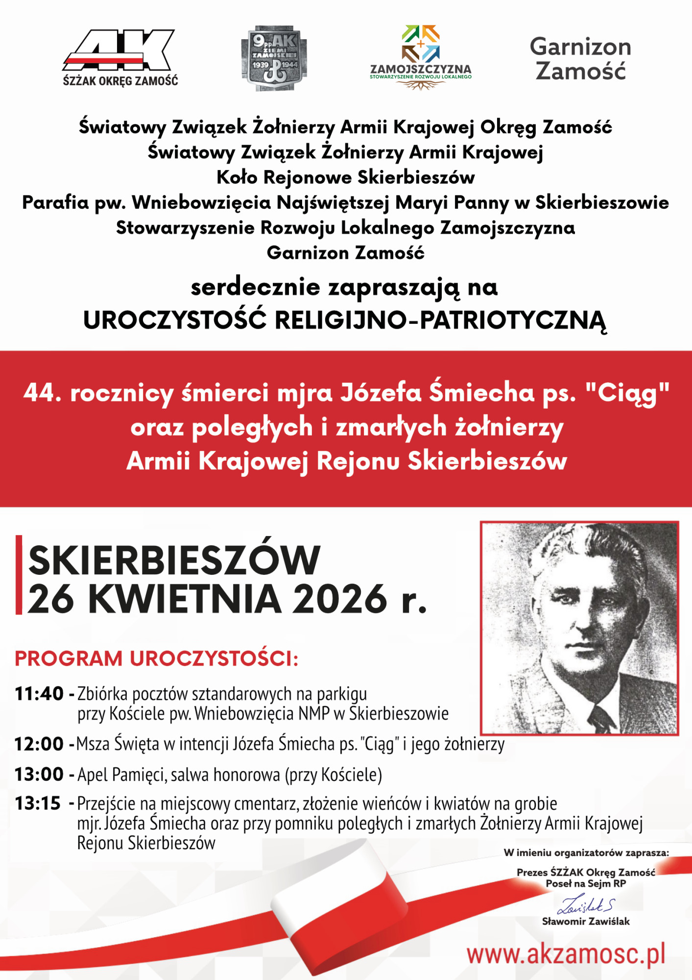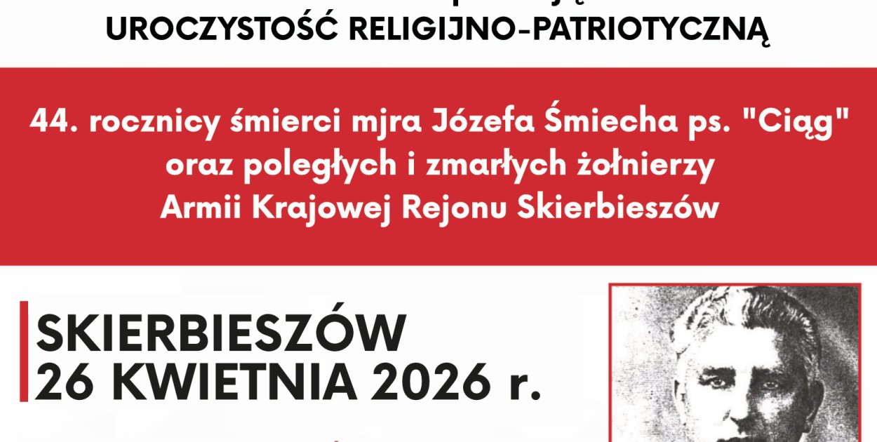 Już 26 kwietnia w Skierbieszowie odbędzie się uroczystość patriotyczno-religijna upamiętniająca 44. rocznicę śmierci mjr. Józefa Śmiecha ps. „Ciąg” oraz żołnierzy Armii Krajowej Rejonu Skierbieszów.