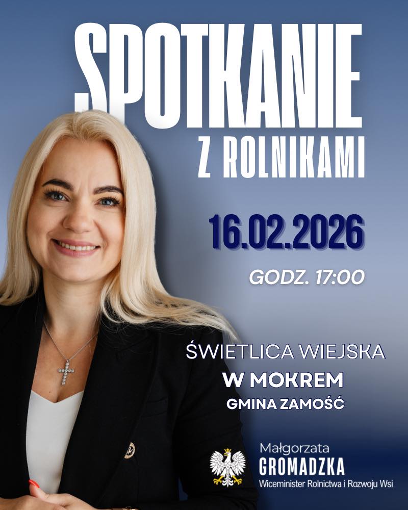 W poniedziałkowym spotkaniu z rolnikami z terenu Gmina Zamość udział weźmie Małgorzata Gromadzka, Wiceminister Rolnictwa i Rozwoju Wsi. Jej obecność nadaje wydarzeniu szczególną rangę i stwarza okazję do bezpośredniej rozmowy o najważniejszych sprawach dotyczących polskiej wsi i gospodarstw rolnych.