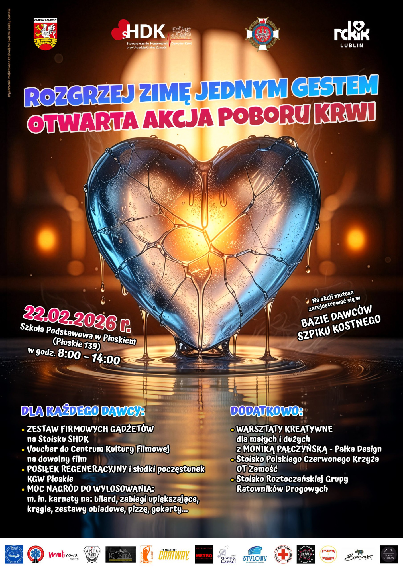 Już 22 lutego w Szkole Podstawowej w Płoskiem odbędzie się wyjątkowa akcja honorowego krwiodawstwa pod hasłem „Rozgrzej Zimę Jednym Gestem”. Organizatorami wydarzenia są Stowarzyszenie Honorowych Dawców Krwi przy Urzędzie Gminy Zamość oraz Samorząd Gminy Zamość. Inicjatywa ma na celu wsparcie banków krwi w okresie zimowym, kiedy zapotrzebowanie na krew jest szczególnie wysokie.