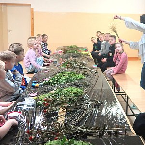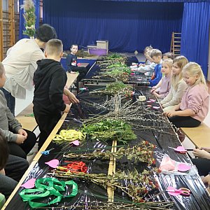 Podczas zajęć uczestnicy dowiedzieli się, skąd wywodzi się tradycja tworzenia palm wielkanocnych oraz jakie elementy powinny znaleźć się w ich klasycznej formie. Omówiono znaczenie poszczególnych roślin i ozdób – od zielonych gałązek symbolizujących życie i odrodzenie, po kolorowe kwiaty będące wyrazem radości. Dzieci pracowały m.in. z tujkami, barwinkiem, baziami, trawami, lnem, czarnuszką oraz zatrwianem, ucząc się, jak łączyć je w estetyczne i trwałe kompozycje.