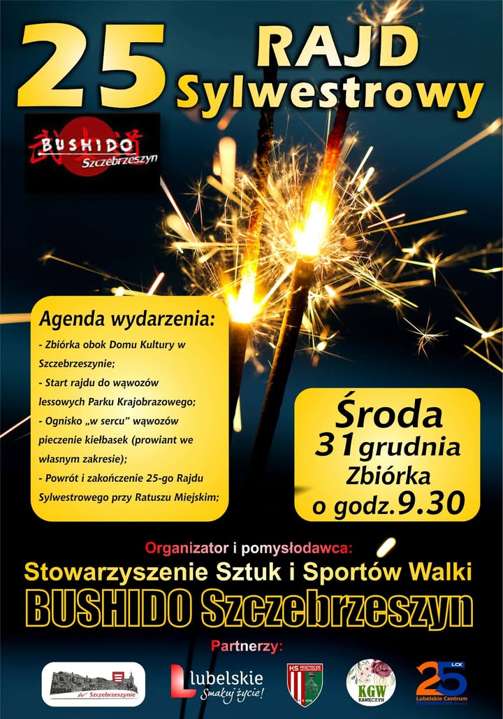 Miłośnicy aktywnego spędzania czasu i lokalnych tradycji ponownie spotkają się w Szczebrzeszynie, by wspólnie pożegnać mijający rok. W środę, 31 grudnia, odbędzie się 25. Rajd Sylwestrowy, organizowany przez Stowarzyszenie Sztuk i Sportów Walki BUSHIDO Szczebrzeszyn.