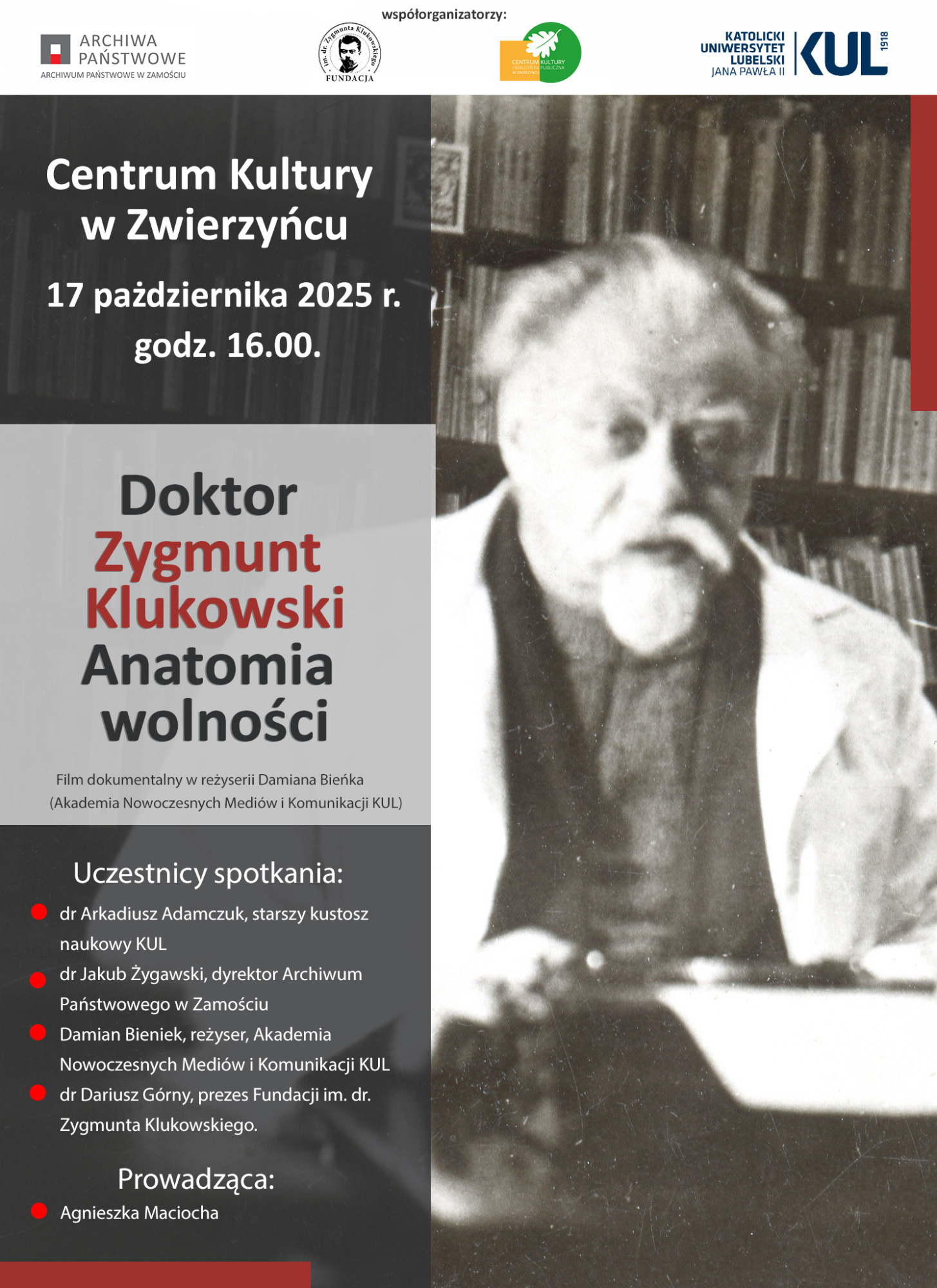 Związany z Zamojszczyzną lekarz, społecznik i patriota – doktor Zygmunt Klukowski – stał się bohaterem filmu dokumentalnego, który powstał we współpracy kilku instytucji naukowych i kulturalnych. Projekcja filmu „Doktor Zygmunt Klukowski. Anatomia wolności” w reżyserii Damiana Bieńka z Akademii Nowoczesnych Mediów i Komunikacji Katolickiego Uniwersytetu Lubelskiego Jana Pawła II odbędzie się w piątek, 17 października, o godzinie 16.00 w Centrum Kultury i Bibliotece Publicznej w Zwierzyńcu.