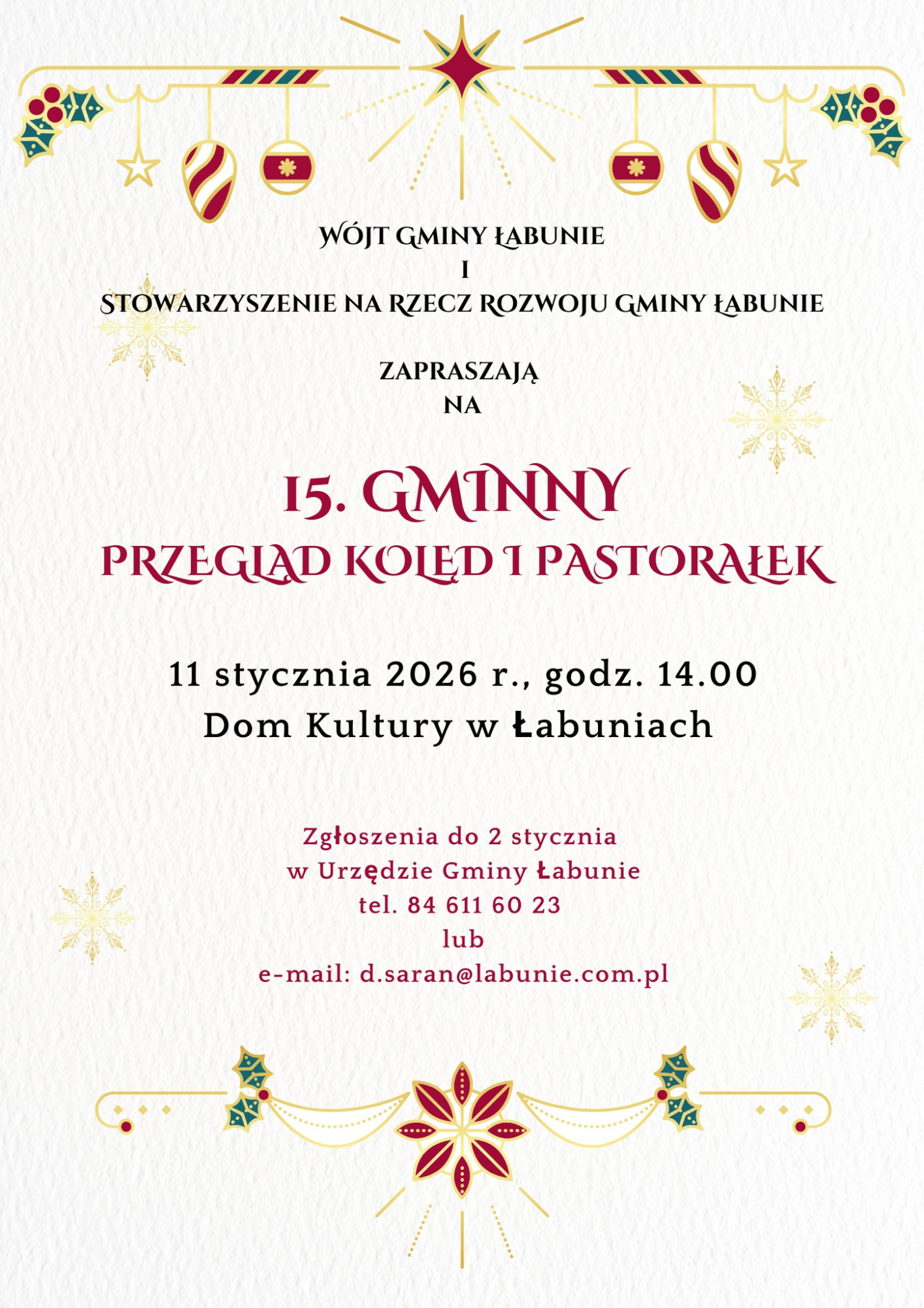 Wójt Gminy Łabunie Mariusz Kukiełka oraz Stowarzyszenie na Rzecz Rozwoju Gminy Łabunie zapraszają mieszkańców do udziału w XV Gminnym Przeglądzie Kolęd i Pastorałek. To wyjątkowe wydarzenie, które na stałe wpisało się w kalendarz kulturalny gminy, będzie okazją do kultywowania bożonarodzeniowych tradycji i wspólnego kolędowania.