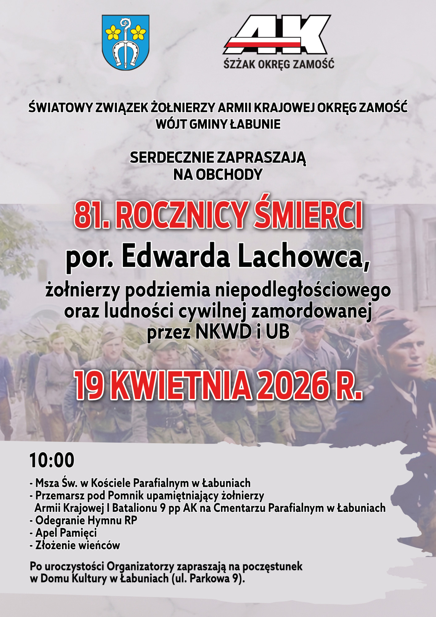 W niedzielę, 19 kwietnia, w Łabuniach odbędą się uroczystości upamiętniające 81. rocznicę śmierci por. Edwarda Lachawca oraz żołnierzy podziemia niepodległościowego i cywilów zamordowanych przez NKWD i UB.
