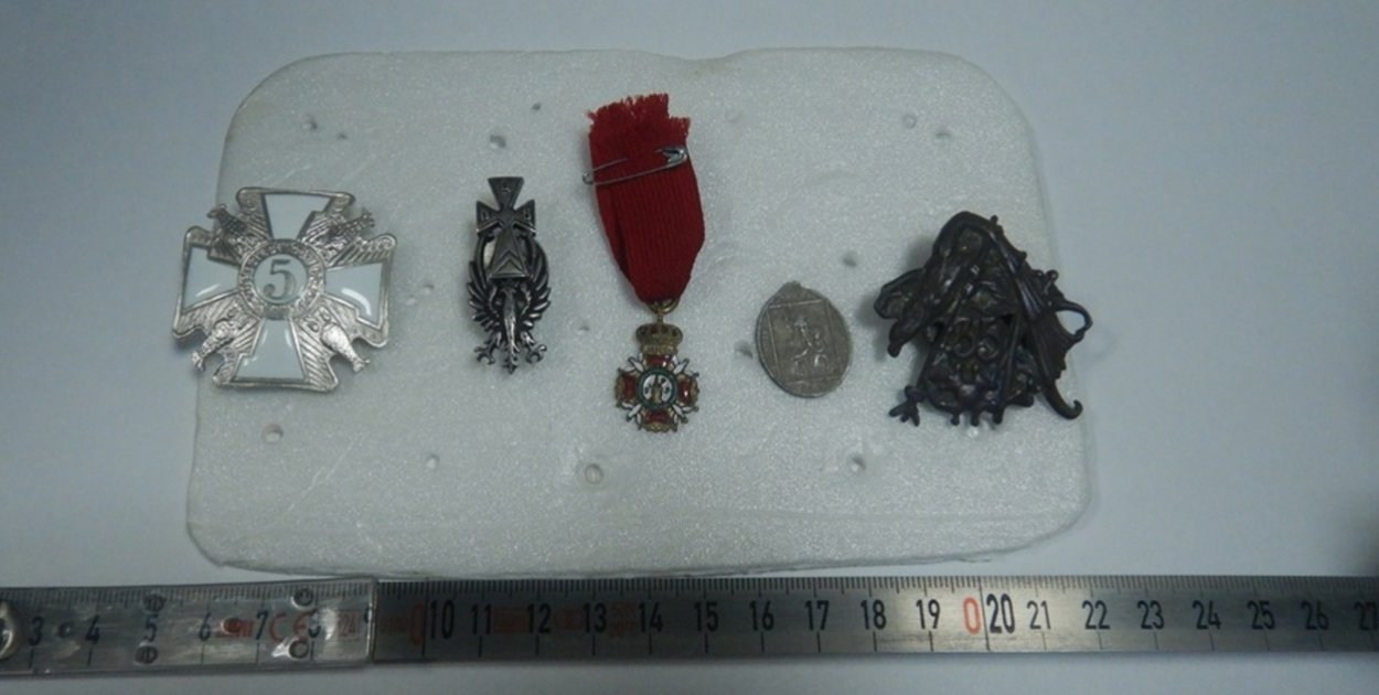 W kabinie pojazdu znajdowało się łącznie 87 elementów, w tym odznaczenia, przypinki i części zapięć. Były to m.in. polskie artefakty II RP: Odznaka komendancka - honorowa Przysposobienia Wojskowego (1918 – 1939), Odznaka 4 Pułk Artylerii Ciężkiej, Odznaka 5 Pułk Strzelców Podhalańskich czy naszywka na czapkę z 1948 r.