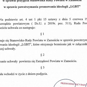 Przyjmuje się Stanowisko Rady Powiatu w Zamościu w sprawie powstrzymania promowania ideologii "LGBT", które otrzymuje brzmienie jak w załączniku do niniejszej uchwały.