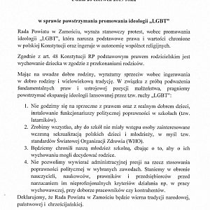 Rada Powiatu w Zamościu, wyraża stanowczy protest, wobec promowania ideologii "LGBT", która narusza podstawowe prawa i wartości chronione w polskiej Konstytucji oraz ingeruje w autonomię wspólnot religijnych.