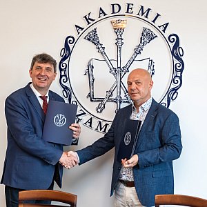 Rektor Akademii Zamojskiej dr hab. Paweł Skrzydlewski, prof. AZ i prezes Akademicko-Uczniowskiego Klubu Sportowego Trefl Zamość Piotr Kostrubiec podpisali umowę o współpracy na sezon 2023/2024.