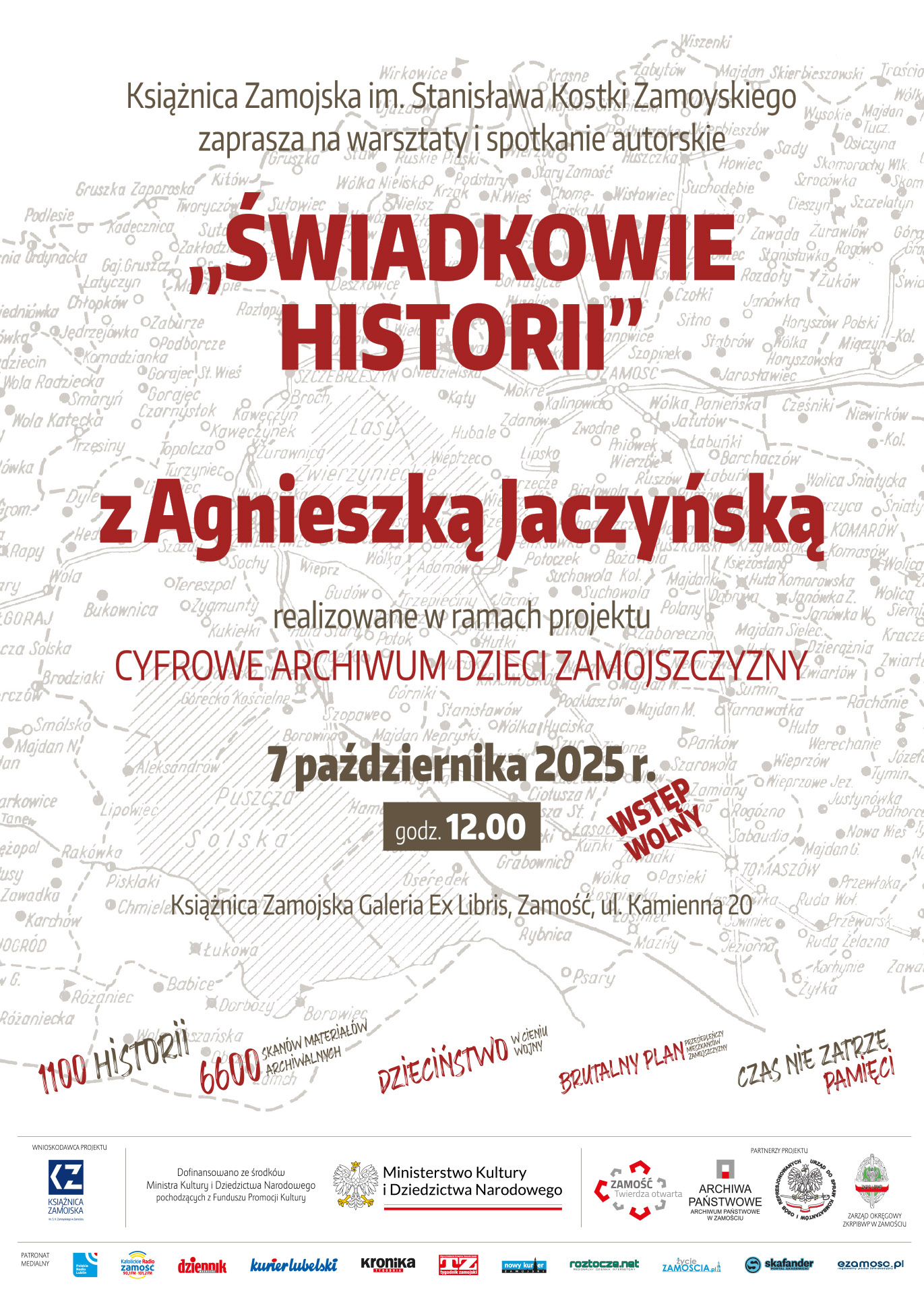 7 października 2025 o godz. 12:00 w Bibliotece przy ul. Kamiennej 20 w Zamościu na spotkaniu autorskim i warsztatach (dla młodzieży z klas VIII) gościć będziemy Agnieszkę Jaczyńską.