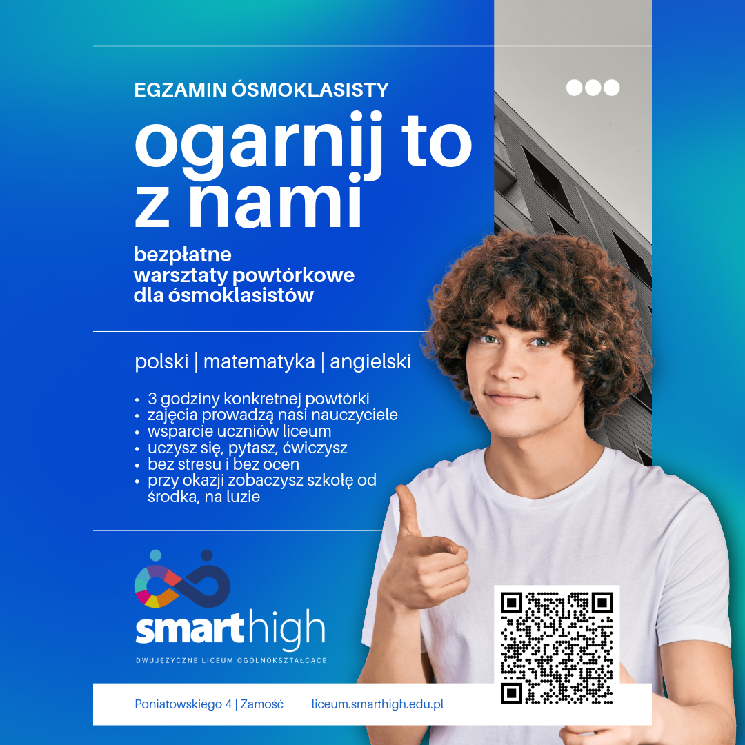 Dwujęzyczne Liceum Ogólnokształcące Smart High w Zamościu zaprasza uczniów klas ósmych szkół podstawowych do udziału w bezpłatnych warsztatach powtórkowych przygotowujących do egzaminu ósmoklasisty.