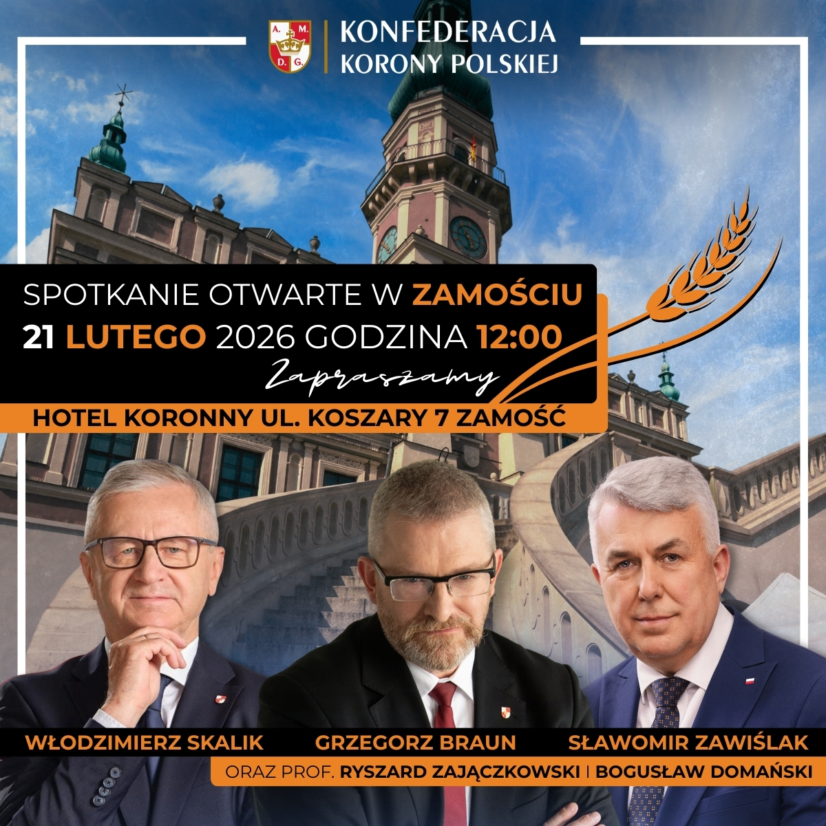 Lider Konfederacji Korony Polskiej spotka się z mieszkańcami w sobotę, 21 lutego, o godz. 12.00 w sali konferencyjnej Hotelu Koronny przy ul. Koszary 7. Organizatorzy zapowiadają otwarte wydarzenie, podczas którego nie zabraknie mocnych wystąpień i bezpośredniej rozmowy z uczestnikami. To nie będzie kameralne, zamknięte spotkanie. Każdy zainteresowany będzie mógł przyjść, wysłuchać przemówień i zabrać głos w dyskusji. A biorąc pod uwagę dotychczasowy przekaz Grzegorza Brauna – można spodziewać się ostrych słów i wyraźnych deklaracji.