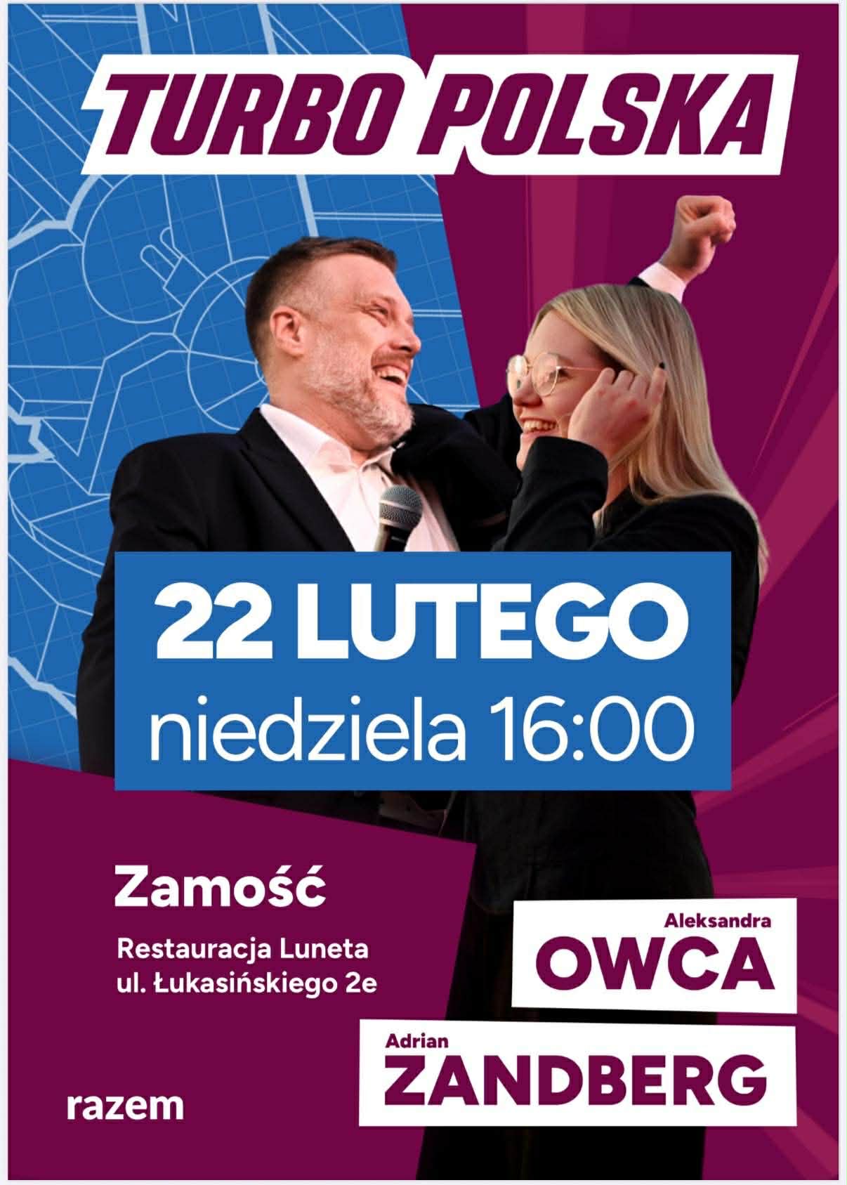 W sobotę 22 lutego oczy politycznej Polski – przynajmniej tej poza wielkimi metropoliami – zwrócą się ponownie na Zamość. To właśnie tu z mieszkańcami spotkają się Adrian Zandberg i Aleksandra Owca z partii Razem. Wydarzenie odbędzie się w Lunecie o godz. 16 w ramach ogólnopolskiego cyklu TurboPolska.